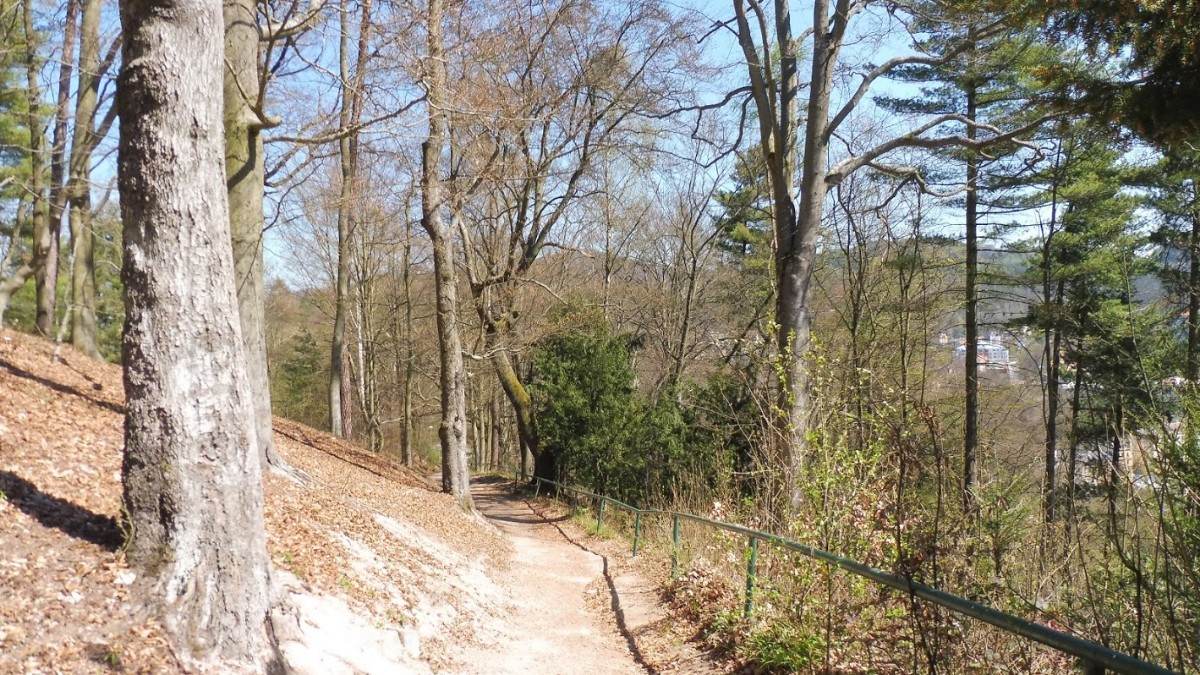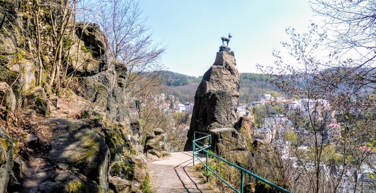 Jenže… lákalo nás dojít a vidět Jelení skok, místo, kde na vrcholu skály nechal král Karel IV. postavit sochu jelena (dnes je to jen kamzík ☹ ), protože podle pověsti z této skály začala při jedné jeho lovecké výpravě prýštit horká voda – pramen, který léčil…