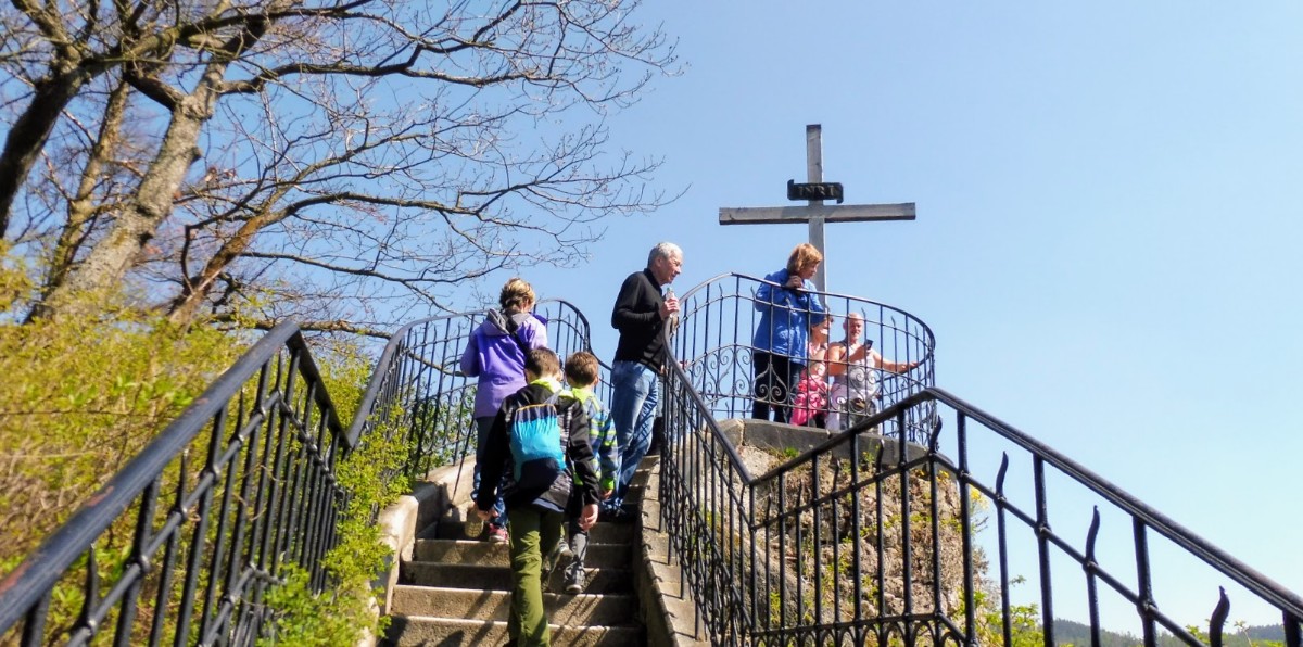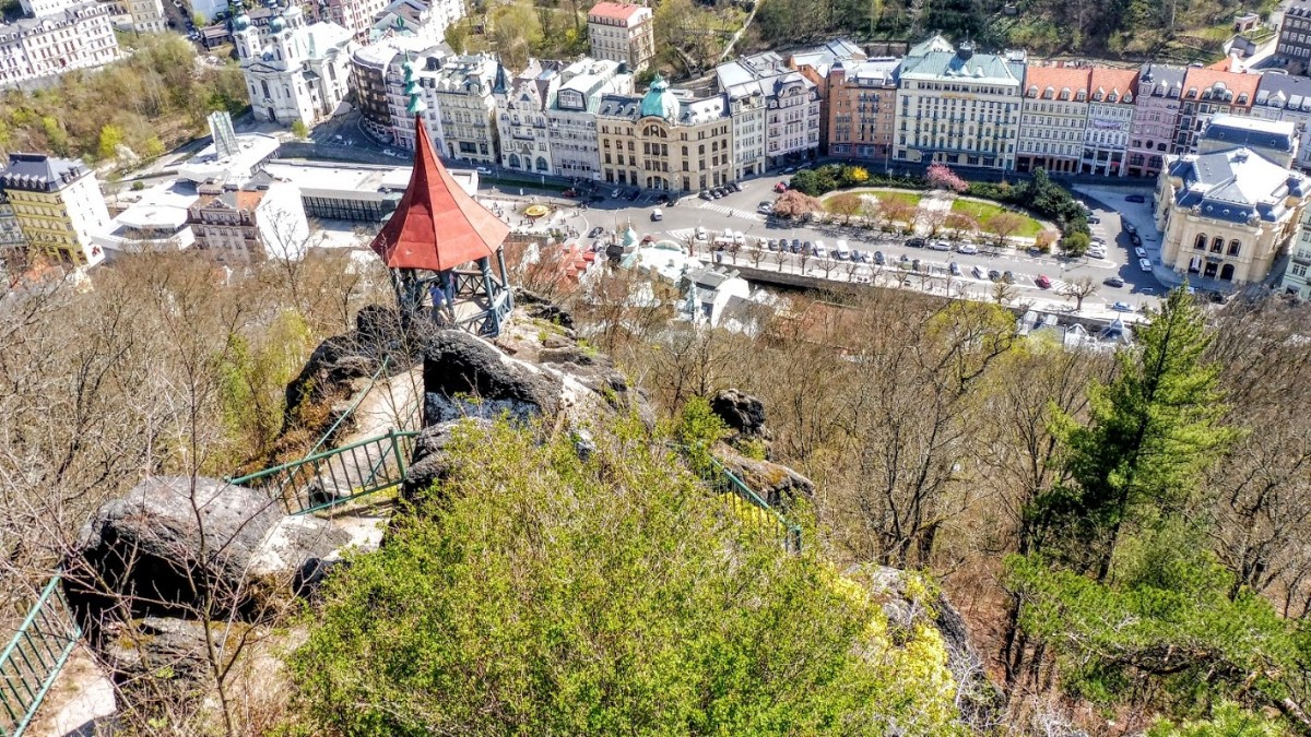 U lanovky psali, že na tuto „zastávku“ je to jen necelý kilometr, a tak jsme se vydali z rozhledny pěšky. Cestou jsme potkali různé památníky, také mezizastávku lanovky, ale šli jsme dál, až jsme došli k vyhlídce Petra Velikého, potom okolo kříže a dále až ke skále Jelení skok. Nad touto ostře špičatou skalou je tyčí patrně nejstarší dřevěný altánek přímo nad centrem Karlových Varů. Ten se podle svého stavitele nazývá Mayerův gloriet, kdy rodák z Karlových Varů Mayer ho zde nechal postavit v roce 1804.