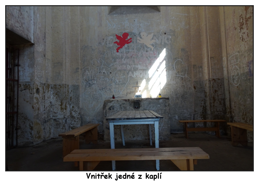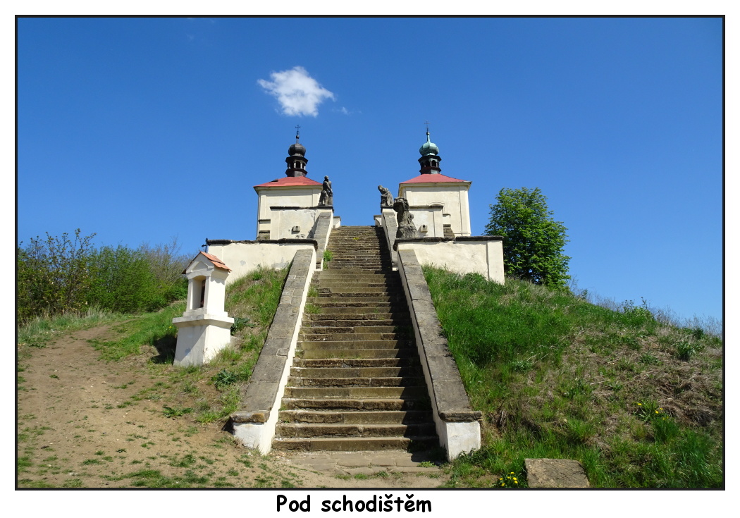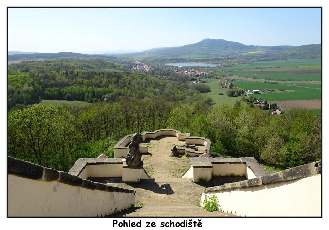Jezuité tu na samém začátku 18. století dali vystavět poutní místo s křížovou cestou a širokým impozantním schodištěm, vedoucím ke dvěma stejným kaplím Nalezení a Povýšení svatého Kříže a kapli božího hrobu mezi nimi na vrchu. Má se za to, že autorem je barokní stavitel Octavio Broggio. Z terasy máte jako na dlani Úštěk, dominantní Sedlo a další vrcholky Českého středohoří. Celý areál byl léta v žalostném stavu, dokud se ho nezleželo nadšencům sdruženým ve Společnosti pro obnovu památek Úštěcka. Jejich úsilím se podařilo nashromáždit i formou sbírky finanční prostředky a barokní poutní místo se opět rozzářilo a svítí do dálky žlutou omítkou a červenými střechami. Na tomto utěšeném místě je radno posedět, pustit z hlavy starosti, vstřebávat energii a oddat se géniu loci.