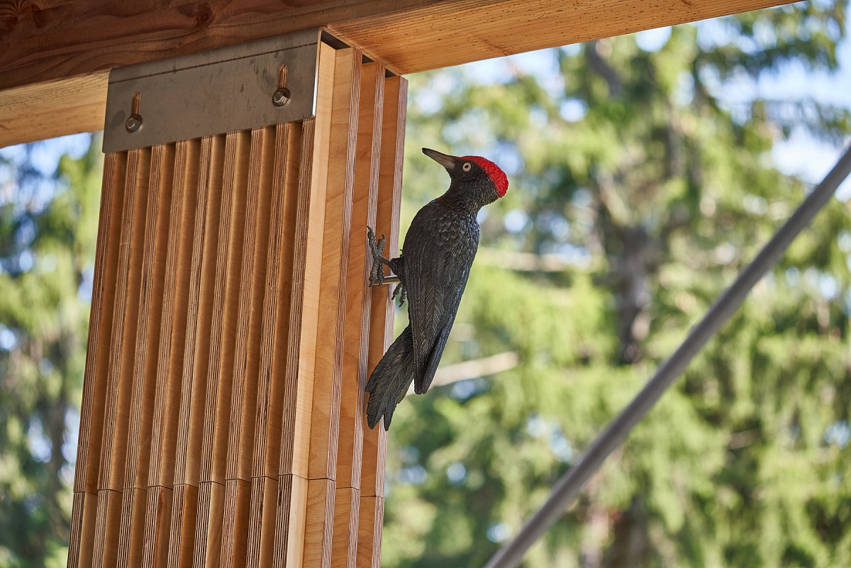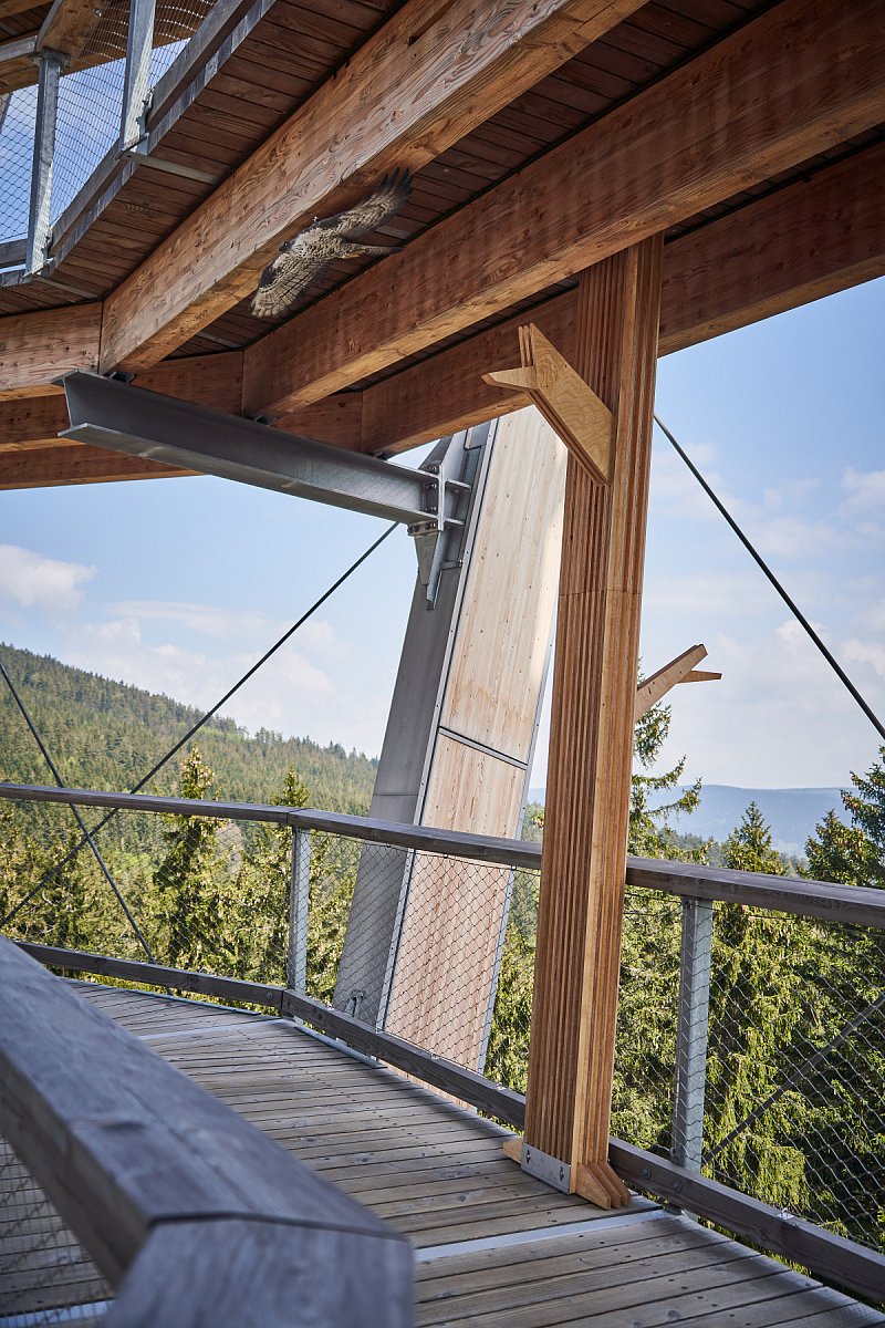Ochoz věže nabízí výhled do korun stromů (ty nejvyšší mají 35 metrů) i na část Krkonoš. Sněžku ale nezahlédnete. Zajímavostí jsou zde Ptačí hodiny, které mají místo číslic dvanáct druhů krkonošského ptactva. Po otočení speciálním klíčem se hodiny rozběhnou a podle toho u jakého obrázku ptáčka se jejich ručička zastaví, vydávají jeho zvuk z reproduktorů. Baví to děti i dospělé.