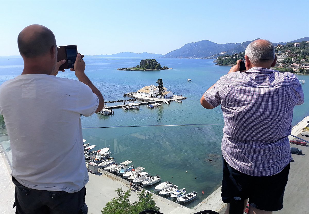 Jsme v kavárně na poloostrově Kanoni. Jde o vyhlídkovou terasu, od které je pár desítek metrů přistávací dráha. A hned za ní moře. Je to bizarní pohled. Moře je rozděleno betonovým mostem, přes který se dá na poloostrov dojít z protější strany ostrova. Je to takový výběžek do moře. Část moře, která obklopuje přistávací dráhu, je mělká a procházejí se v ní rybáři. Občas se sehnou, seberou rybu, vody mají tak po kolena. Nad hlavami jim přitom duní velké letouny přivážející co dvacet, třicet minut na ostrov další várku turistů. Nebo letouny, které právě odlétají. Je to legrační pohled na barevný Boeing přistávající těsně nad hlavou starého řeckého rybáře na malé oprýskané loďce. Není divu, že toto místo přitahuje fotografy jako magnet. A stačí se z mostu ohlédnout na opačnou stranu a vidíme symbol ostrova Korfu, jeho hodně fotografovaný Myší ostrůvek a další výběžek s klášterem Vlacherna.