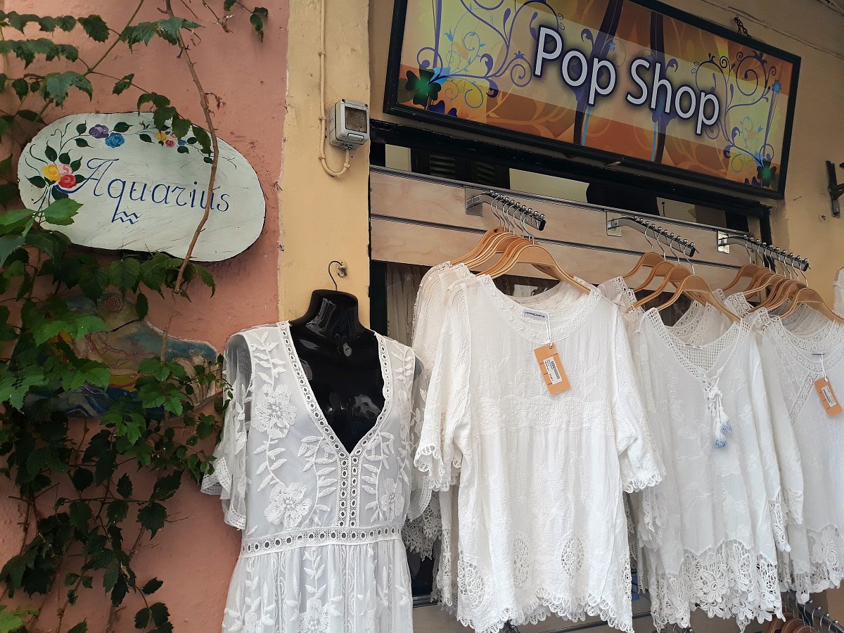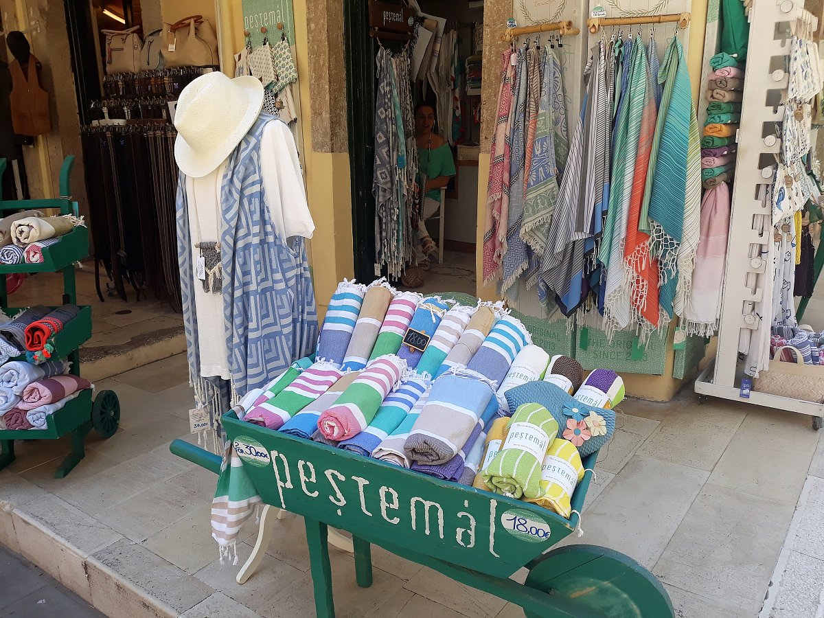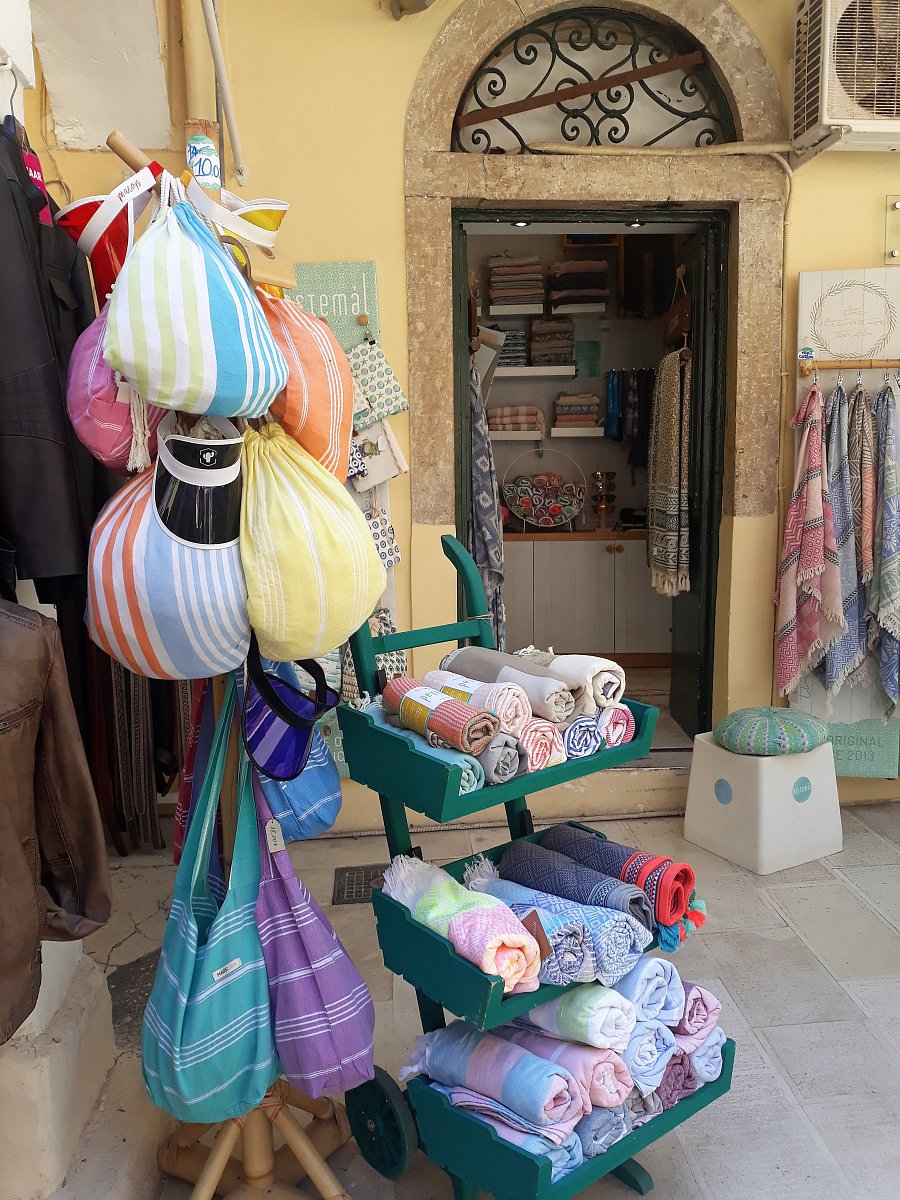Velmi zajímavým a častým artiklem tady jsou bavlněné přehozy. Jsou smotané do ruliček, naskládané do košů, vystavené před obchody. Stačí pak vejít dovnitř a člověk jich tam najde mnohem víc. Jsou v přírodních barvách nebo řeckých bílomodrých kombinacích a skvěle poslouží jako domácí přehoz na cokoli nebo třeba místo ručníku na ležení na pláž. Nebo se do nich dá zabalit při chladných večerech. Dají se pořídit v rozmezí od patnácti do dvaceti eur a jejich výdrž je kupodivu dlouhá, takže díky nim člověk může vzpomínat na příjemný den v Kerkyře doma třeba ještě několik dalších let.