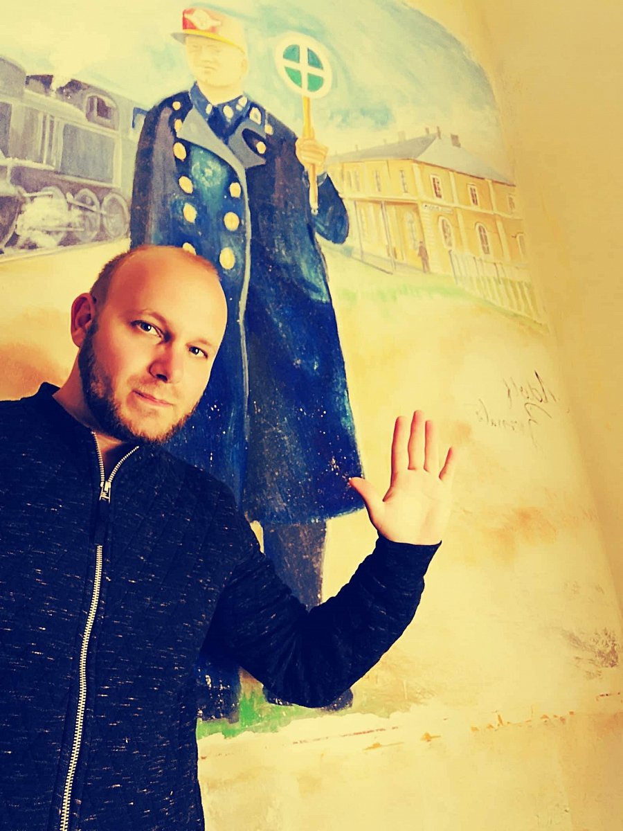 Na nádraží jsme se pozdravili s výpravčím, byť byl jen na obrázku. Ten skutečný by se mi líbil více s plácačkou a píšťalkou z dob minulých.
