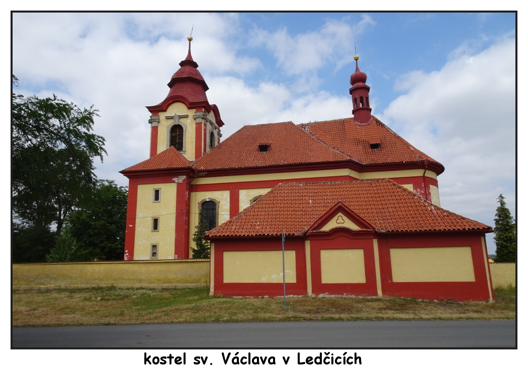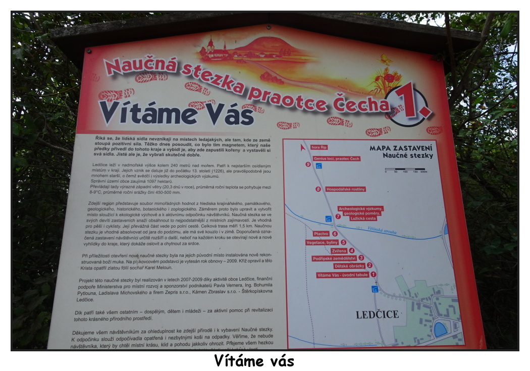Z Ledčic je to k úpatí Řípu jen asi pět kilometrů, a přesto se projdete dvěma kraji a dvěma okresy. Ledčice totiž leží na samém okraji Středočeského kraje a okresním městem mu je Mělník, zatímco Říp máme v kraji Ústeckém a okresním městem mu jsou Litoměřice. Ledčice je poměrně malá obec, obklopená lány polí. Mají tam kostel sv. Václava, který nemůžete přehlédnout při jízdě po dálnici D8. Však vás taky hukot dálničního provozu bude provázet drahnou dobu při chůzi romantickou krajinou. Nedaleko vyrostla štěrkopískovna. Jako tip na výlet s dětmi by se mohla hodit informace o HistoryParku, kde se mohou seznámit s prací archelologa a historika, zkusit si vykovat hřebík, utkat látku apod.