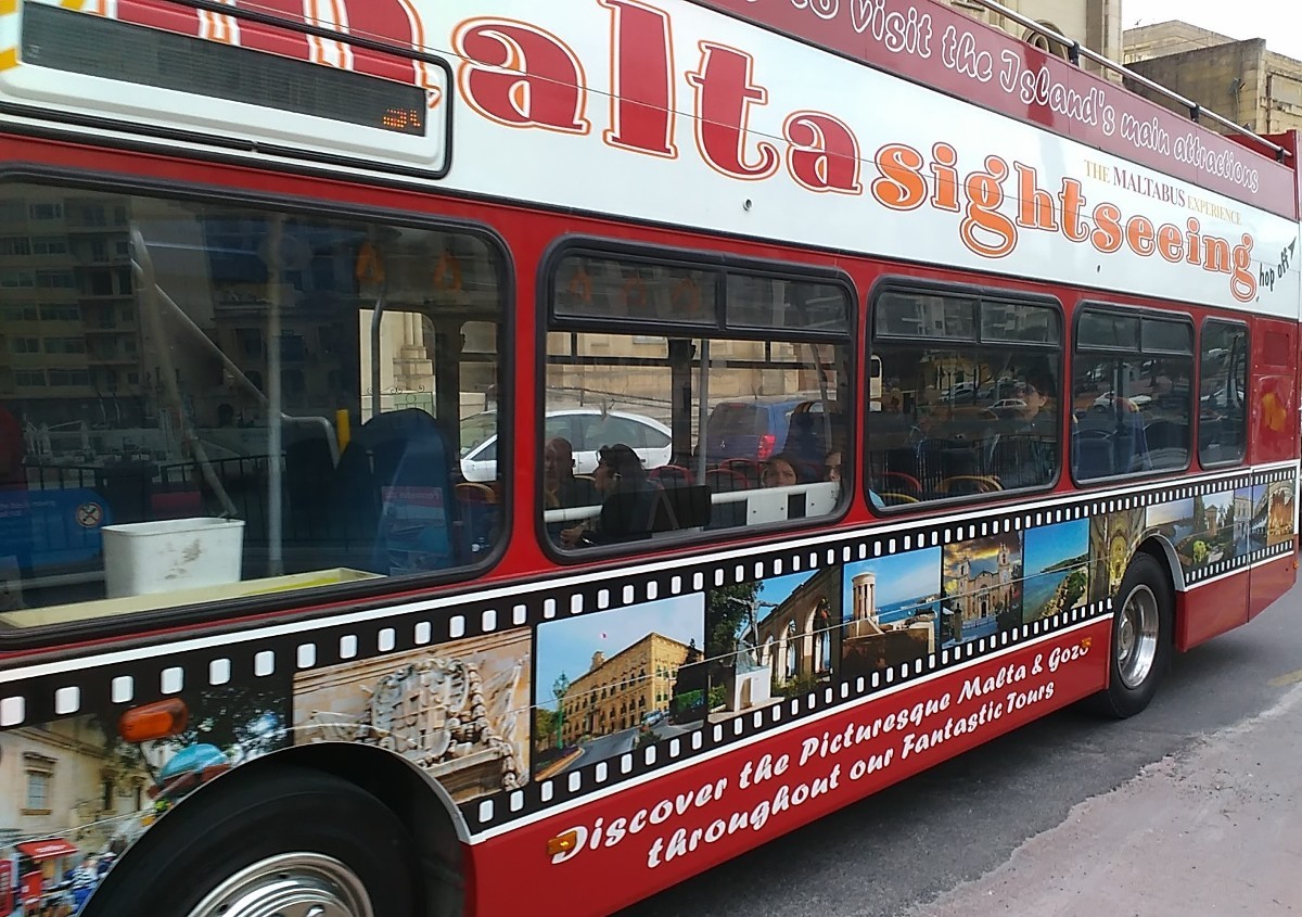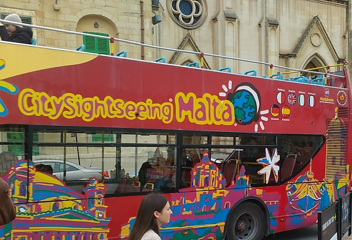 Pro jistotu jsme se usadily ve spodním patře, kam na nás déšť nemohl. Obdržely jsme sluchátka, zvolily vyhovující jazyk a snažily se porozumět. Na Maltě je úředním jazykem maltština a angličtina. Pro turisty byl k dispozici v těchto autobusech výběr z osmi jazyků (češtinu byste hledali marně). Pro nás bylo první zajímavou zastávkou okružní jízdy ostrovem město Mosta.