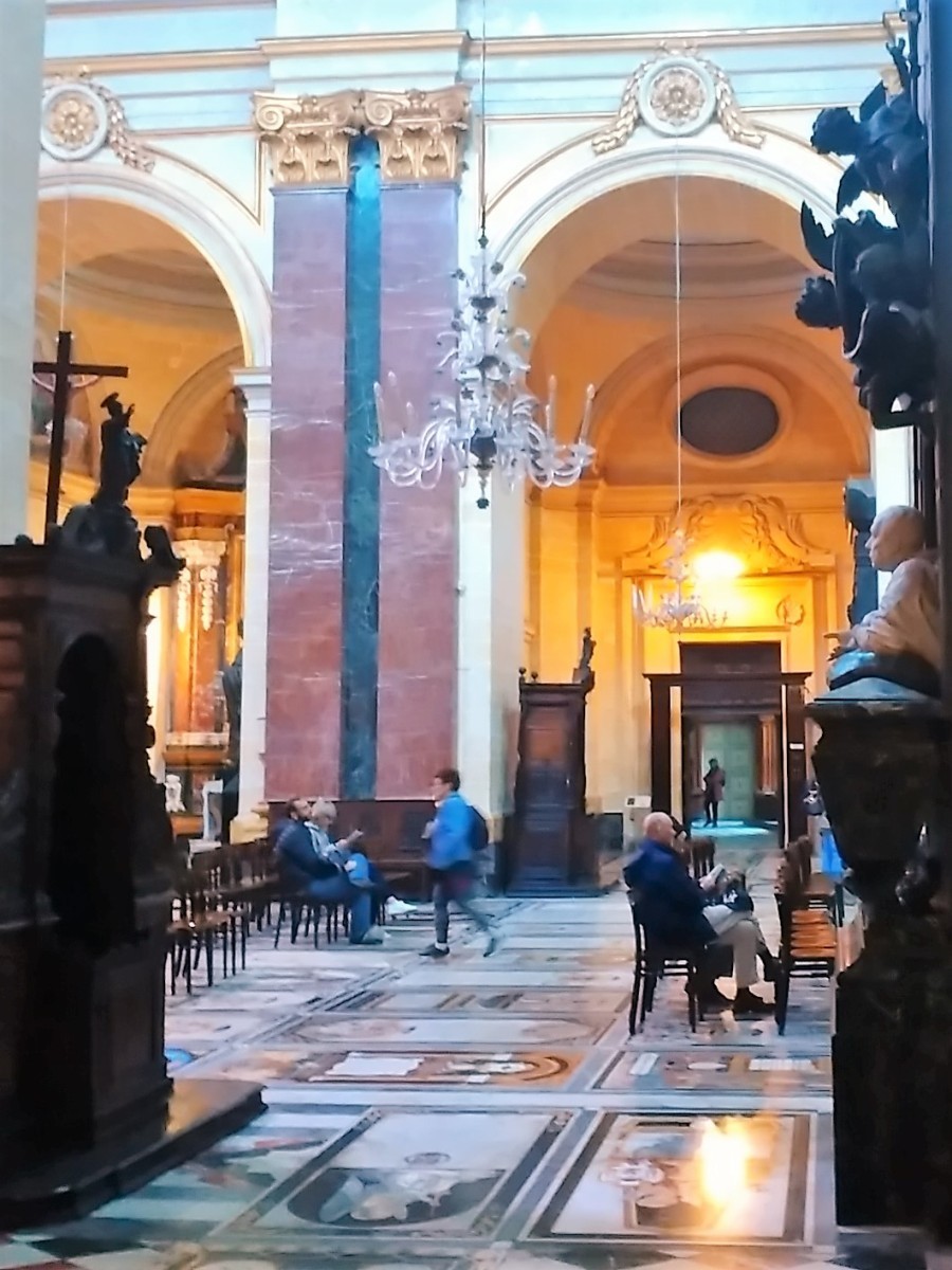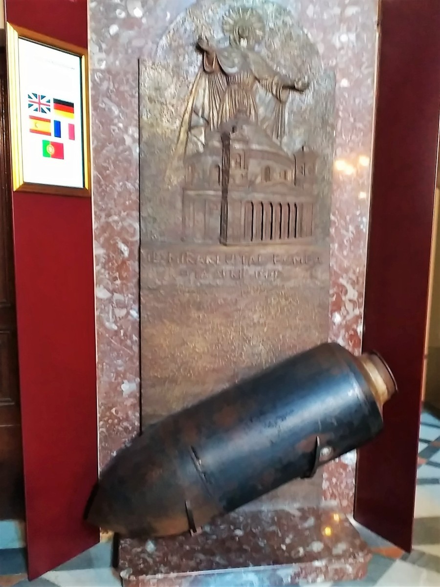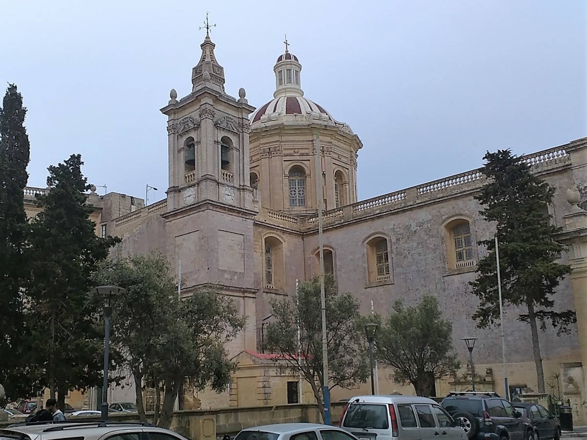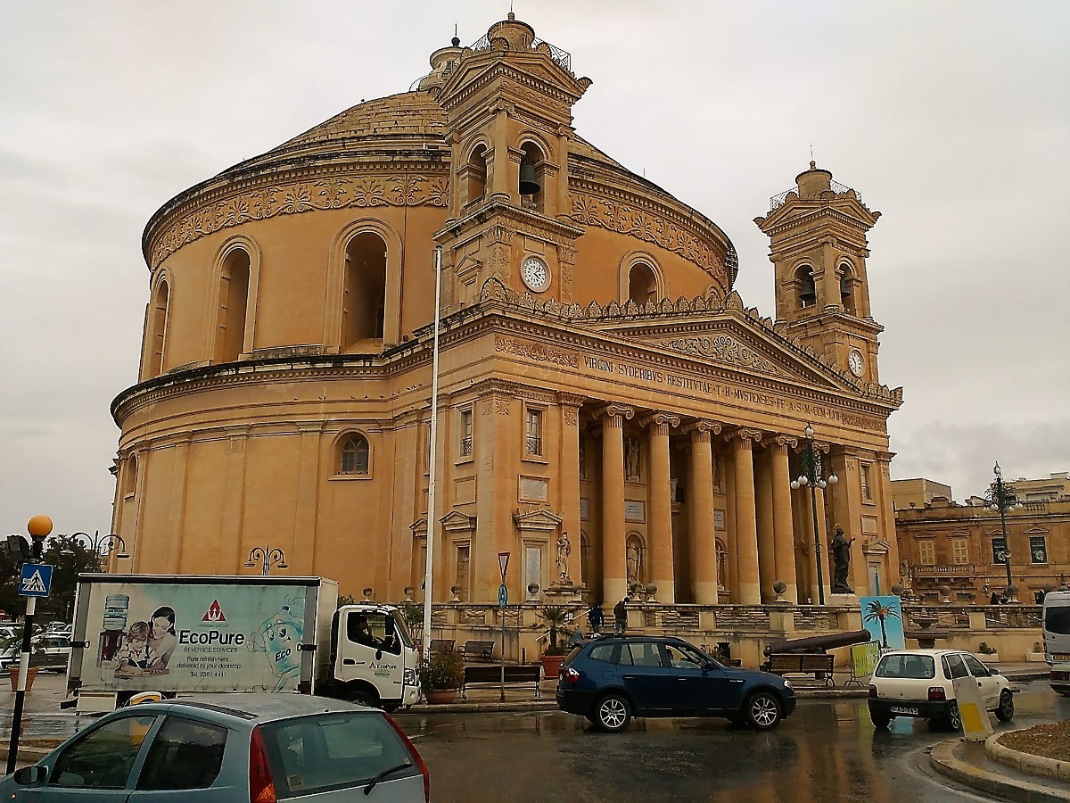 Jde o farní kostel Panny Marie, který byl vybudován z pískovce v letech 1833 – 1857. Kupole sice není nejvyšší, ale zato má úctyhodný průměr 39,6 metrů, a tím se řadí mezi největší evropské chrámové kupole. Zakoupily jsme si vstupenky za 5 Eur, které umožňovaly prohlídku celého chrámu, včetně výstupu po schodech na střechu Dómu a rovněž do vnitřního ochozu pod kopulí. Na této stavbě maltského architekta Giorge Grogneta de Vassé je zvenčí patrná jeho inspirace římským Pantheonem. Střechu jsme brzy opustily, žádný výhled do daleka se nekonal. Z oblohy visela mračna, hustě pršelo.