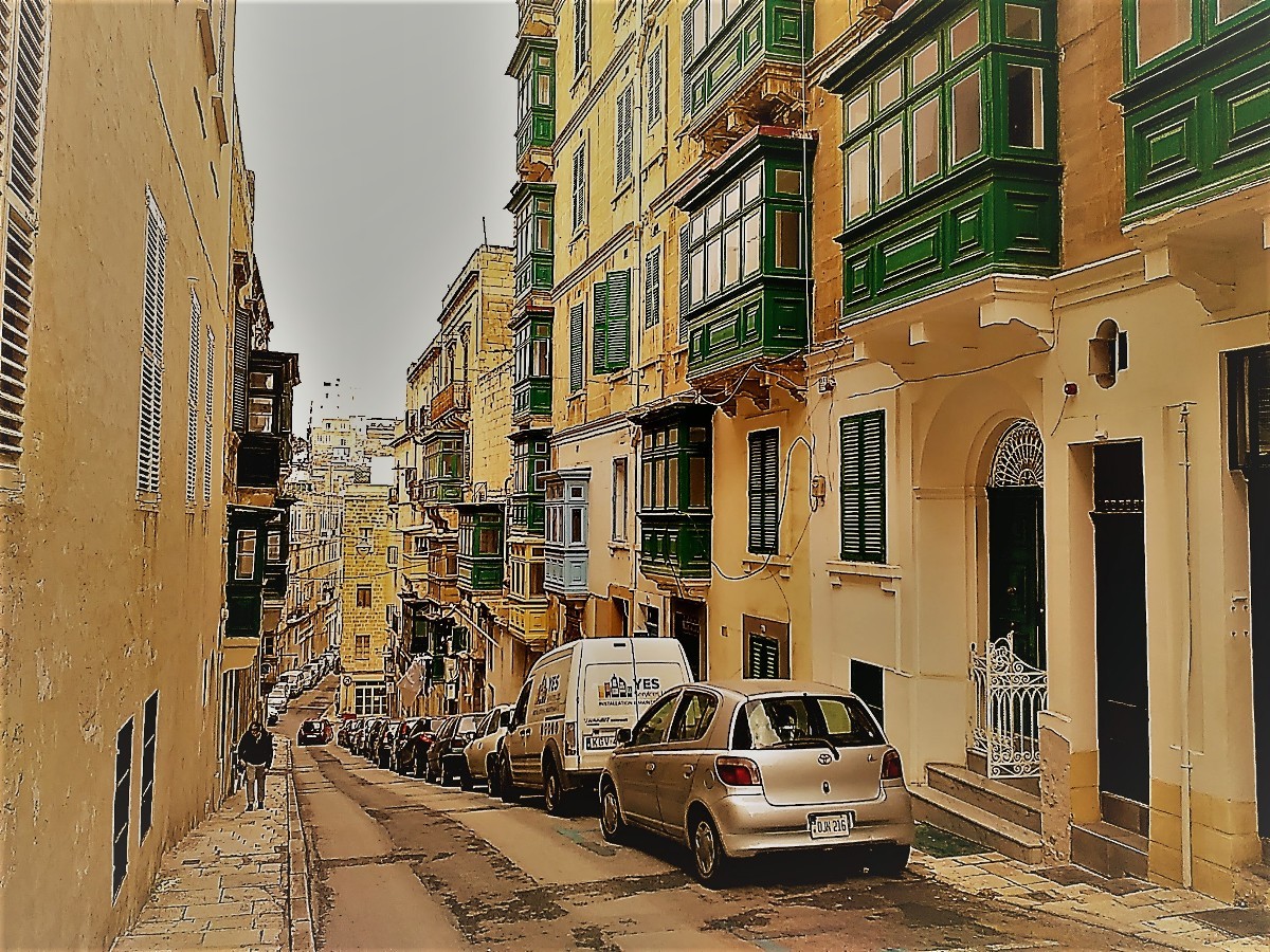 Dolní a Horní zahrady Barraka jsou vystavěny nad sebou. Sloupové kolonády byly zbudovány vysoko nad zálivem v 16. století. Je to nádherné místo k odpočinku s úžasným výhledem na moře. Vyhlídkový výtah do Horních zahrad jezdí od roku 2012 z nábřeží, blízko stanoviště trajektů k Trojměstí (tam se vypravíme až poslední den). Výtah pojme 21 cestujících a stoupá do výšky 58 metrů. Na terase pod Horními zahradami je umístěna Čestná baterie, odkud se přesně v 16,00 hodin ozval výstřel z kanonu. Dlouhý zástup turistů, opřených nahoře o zábradlí, čekal na tuto „atrakci.“  Stihly jsme to právě včas a rovněž jsme zahlédly krouživý obláček, vzdalující se od široké hlavně. Davy se spokojeně rozcházely a my si vyhledaly zastrčené uličky mimo hlavní zájem turistů. Uličky s tajemným kouzlem starousedlíků, bavících se bezstarostně po sousedsku uprostřed ulice mezi zaparkovanými auty. Nikdo zde nikam nespěchal, ani my jsme nespěchaly. Proč taky? Ten poklid se nám moc líbil a plně jsme si mohly vychutnat krásu a barevnost těch proslulých balkonů, pro Maltu tak typických.