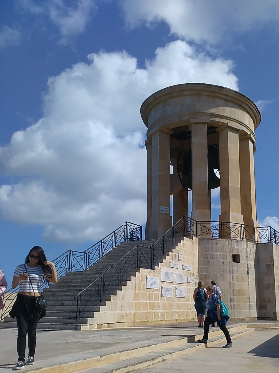 Jen o několik desítek kroků dále, již mimo areál, se před námi objevil památník Siege Bell Memorial, vztyčený nad vodami Grand Harbour. Je připomínkou nepřetržitého obléhání v rozmezí let 1941 – 1943, kdy zahynulo na 7000 civilistů a vojáků. V neoklasicistní kolonádní zvonici je zavěšen největší maltský zvon.