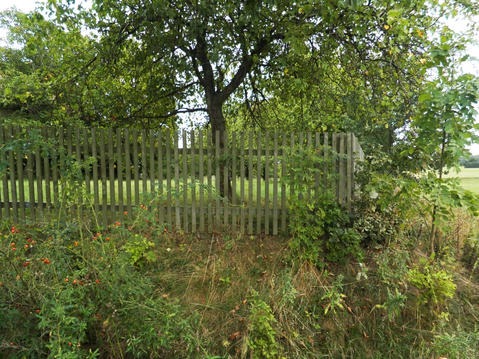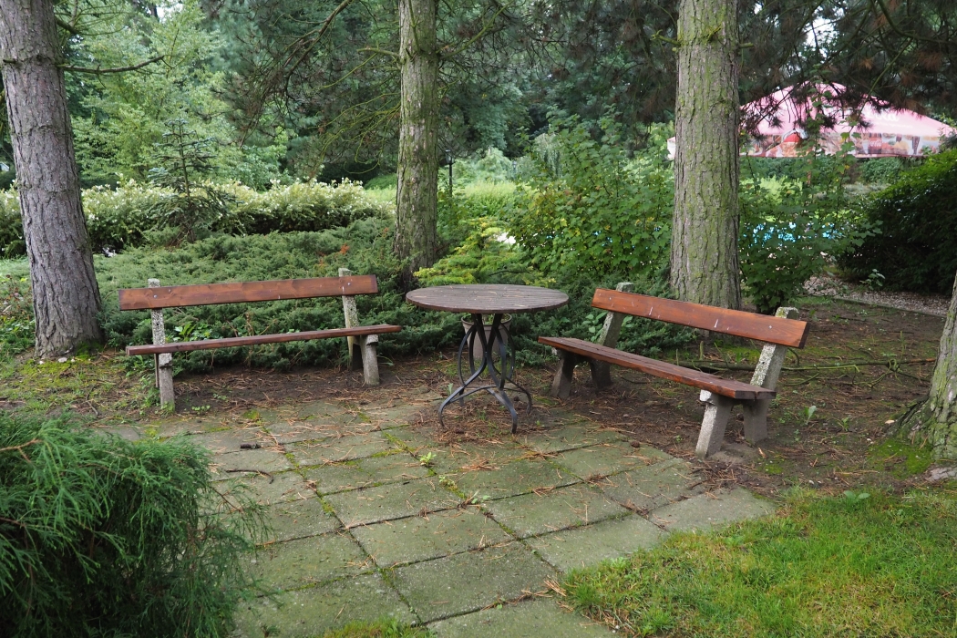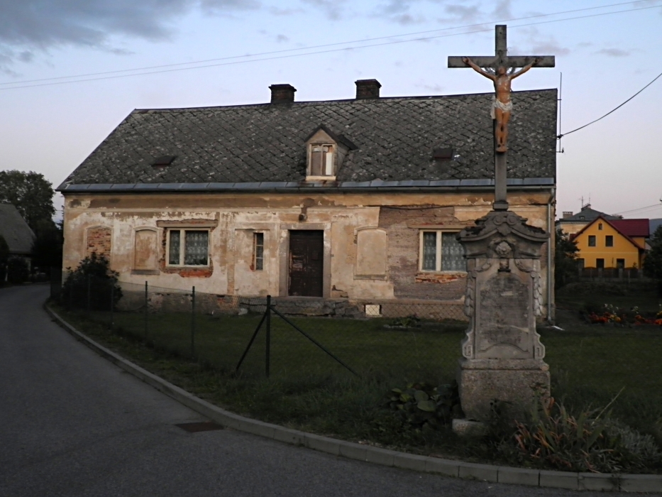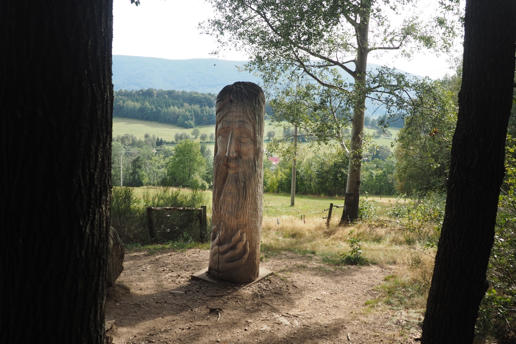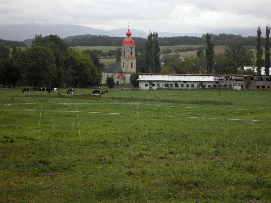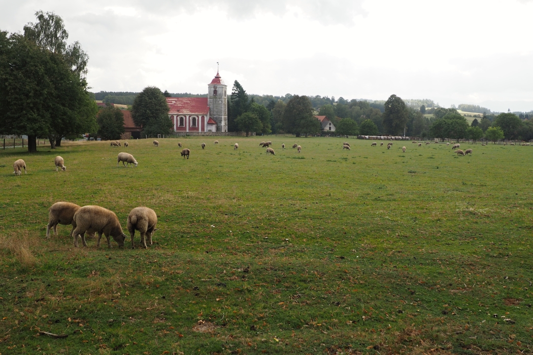 U hřbitovní zdi se snažím poskládat na malý kamenný patník, abych se nasvačil. Široko daleko jediné místo, kde se dá na něco sednout.  Nepohodlné, všechno musím držet v ruce a padá mi to. K hřbitovní brance přicházejí muž se ženou, senioři, jako já. Pozdravím první, když jsem tu cizí. Oba odpoví a pán mi povídá: „To budete mít lepší tamhle za kapličkou“. Otáčím se a koukám na padesát metrů vzdálenou kapličku mezi dvěma lípami. Pán pokračuje: „Ono to odtud není vidět, vzadu je stůl a lavice“. Poděkuju a stěhuju se. Fakt, za kapličkou je bytelný stůl s lavicí, můžu se vybalit, rozložit a najíst jako člověk.