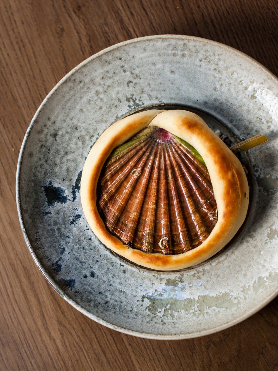 – pečená hřebenatka v chlebu, fermentovaná švestka a celerové jus