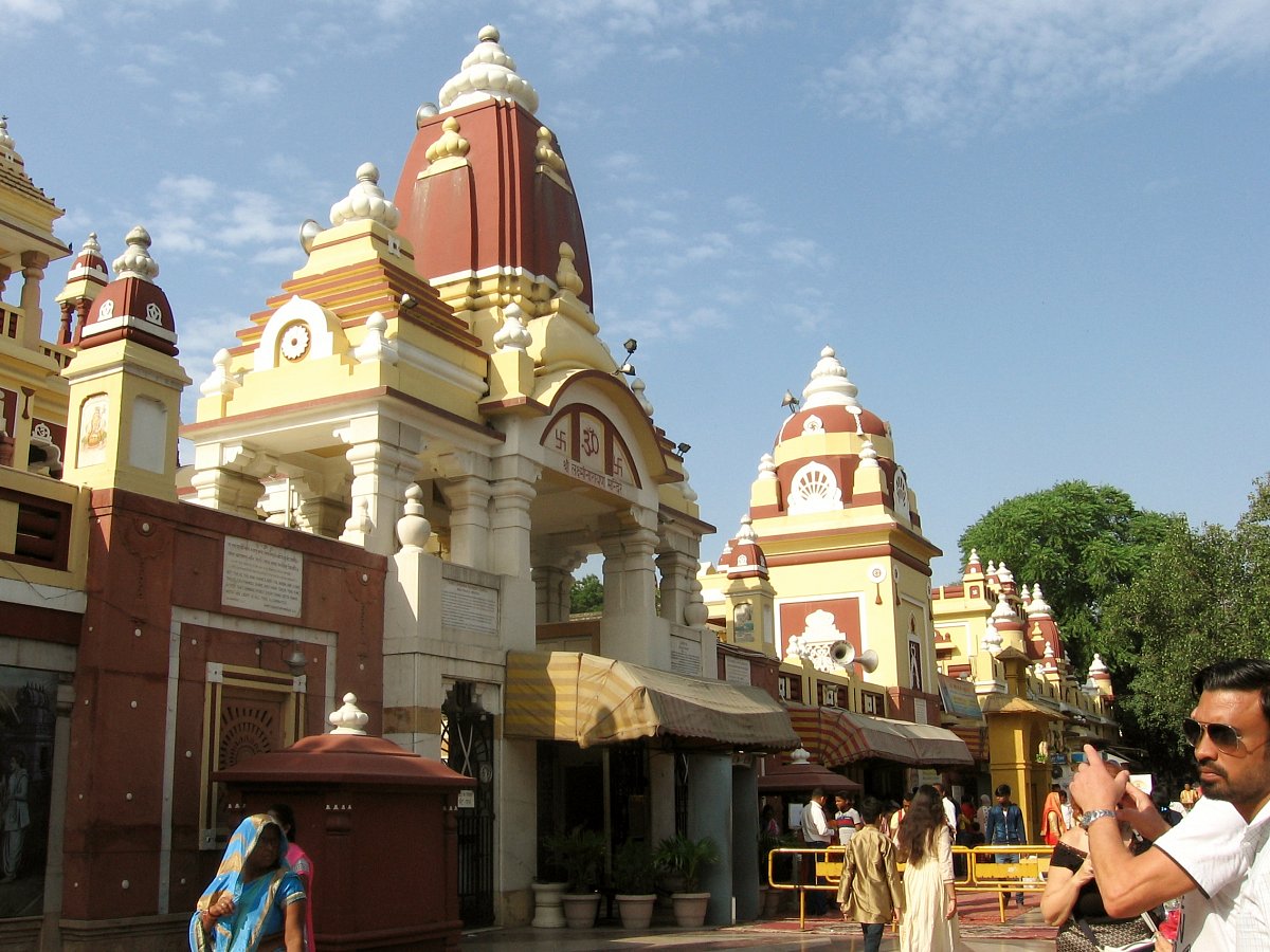Další byla návštěva Lakshmi Náráyan mandír, je to chrám z r. 1938 a postavil ho průmyslník Birla a říká se mu Birla mandír. Byl to první chrám bez kastovního omezení. V hlavní svatyni je vyobrazen Višnua a Lakshmí, což je jeho žena. Kolem je mnoho dalších svatyň. Vstup do chrámu byl zajímavý, vše odložit, foťák, mobil, batoh, boty, projít rámem muži a ženy zvlášť a osobní prohlídka. Uvnitř krásné, všude svastika, lidé seděli na zemi, rozjímali, nechali si barvit třetí oko. Bohužel fotky mám jen z chodníku před chrámem.