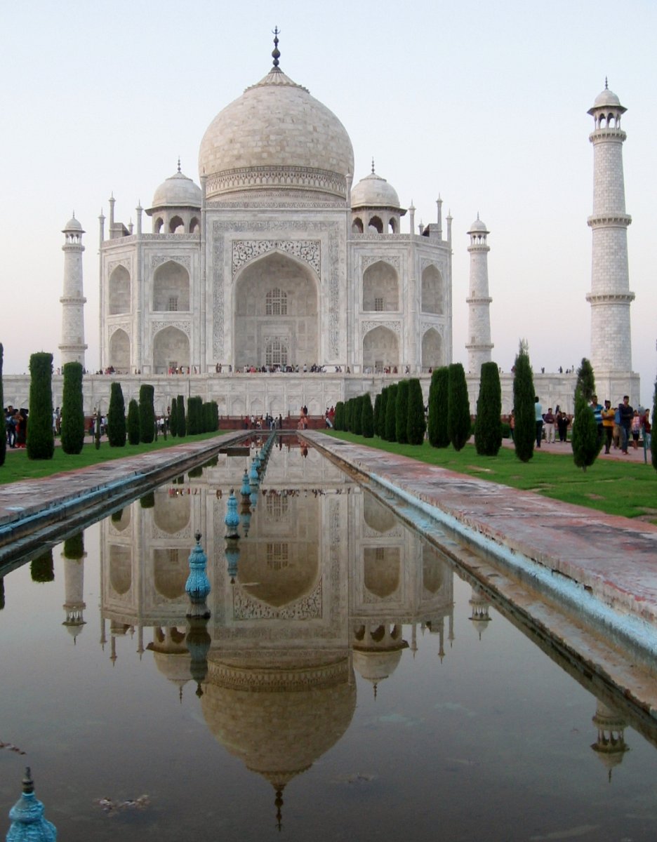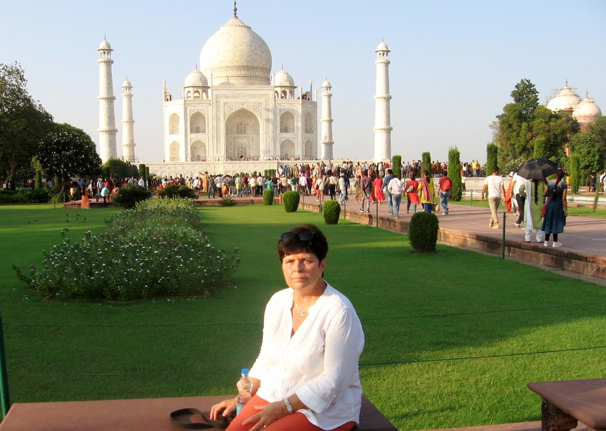 Odpoledne byla na programu mnou nejvíce očekávaná stavba Tadž Mahal, což je symbol Indie. Mauzoleum nechal postavit Šáhdžahán Mahal na památku své zesnulé manželky Muntaz Mahal - Perly Paláce. Zemřela při posledním porodu ve věku 36 let. Porodila mu 8 synů a 6 dcer. Sáhdžahán ji moc miloval, truchlil dlouho a po 2 letech jí nechal stavět Tadž Mahal – Korunu Paláce. Ten symbolizuje věčnou lásku a krásu. Stavěl se od r. 1632 – 1654, tedy 22 roků, ale je to nádhera. Celý komplex je z mramoru na vysokém podstavci a po bocích má 4 minarety. Již před vstupem na podstavec jsme si museli na boty dát návleky, které se dávají při vstupenkách. V mauzoleu měla být jen manželka, ale jejich syn nechal dodělat druhý náhrobek a jsou tam spolu. Fotit se uvnitř nesmělo, jen venku. Tadž Mahal je postaven na břehu řeky Jamuny v krásném parku s umělým kanálem, ve kterém se zrcadlí i vstupní brána. Po celém parku bylo hodně lidí, kteří obdivovali tuto nádheru. Tadž Mahal je postaven z bílého průsvitného mramoru, zdoben je jemně broušenými kameny. Mramor se během dne mění, ráno je narůžovělý, při slunci je až zlatý a večer bílý.