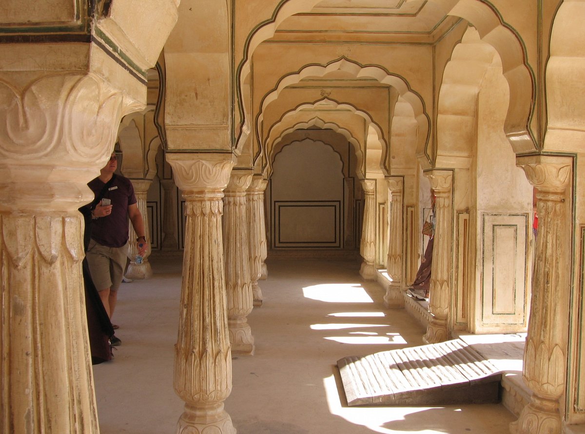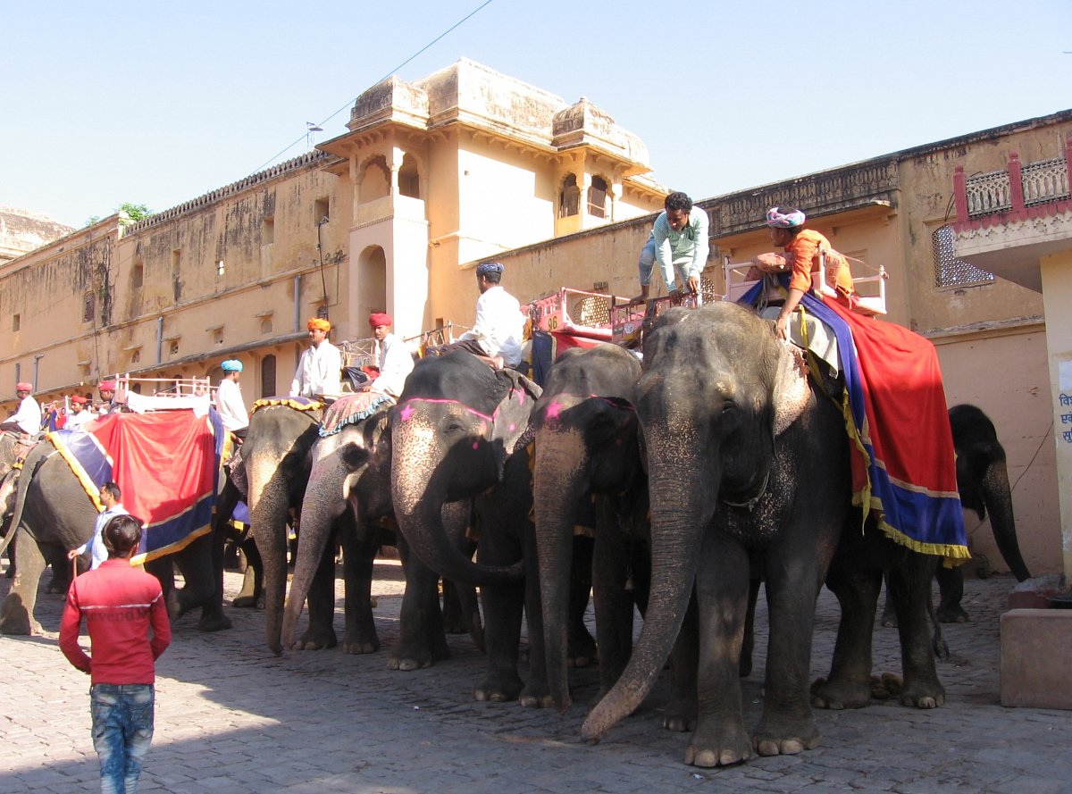Dále jsme pokračovali kousek za Džajpur a zastavili pod pevností, ta byla na kopci nad silnicí, byla rozsáhlá a kolem byla zeď, trošku připomínající Čínskou zeď. Byla to pevnost Ámbér. První byla vystavěna v 11. století a ta nynější je ze 16. století. Původní pevnost tak rozšířili na honosný palác. A nyní nás čekalo překvapení – dole stáli sloni s nosítky a my jsme se na nich po dvou vyvezli do paláce. Bylo to zajímavé, ale kdysi se mi více líbili velbloudi. Sloni nás zavezli Sluneční bránou – Súradž pól na nádvoří, kde byly suvenýry a občerstvení. Po schodech jsme vyšli k chrámu a pak dalším až na nádvoří, které bylo vyhrazeno audiencím. Po prohlídce další krásné památky nás čekalo další překvapení, jízda z kopce dolů v džípech.