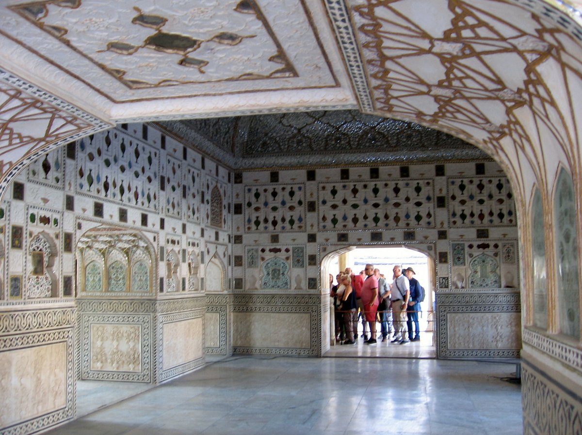 Pak jsme se přemístili do Džajpuru do Městského paláce, který je uprostřed města a je to i dnes sídlo maharadži. Postavil ho Sawai Jai Sindh v r. 1729 - 1732. Přístupná je jen část paláce, jako City Palace Muzeum maharadži Savai Mám Singha II. Jsou zde koberce, zbraně, oděvy maharadžů a dvě stříbrné nádoby na posvátnou vodu z Gangy. Jsou hodně veliké, jsou na 8182 l vody. Tu si vezl do Londýna v r. 1901 s sebou maharadža Mádho Singha II. Tyto nádoby jsou zapsané i v Guinnessově knize rekordů. Mohli jsme se projít audienčním sálem s velkým trůnem a obrazy maharadžů. Nesmělo se fotit a jeden náš účastník to neslyšel, tak zaplatil pokutu. Pak jsme prošli bránou na velké nádvoří se čtyřmi malovanými portály s ročním obdobím. Tu jsme viděli vlát vlajku, tak maharadža byl v paláci. Ten nynější je velmi mladý, má 45 let a je moc hezký, studoval v Anglii a nyní se věnuje modelingu.