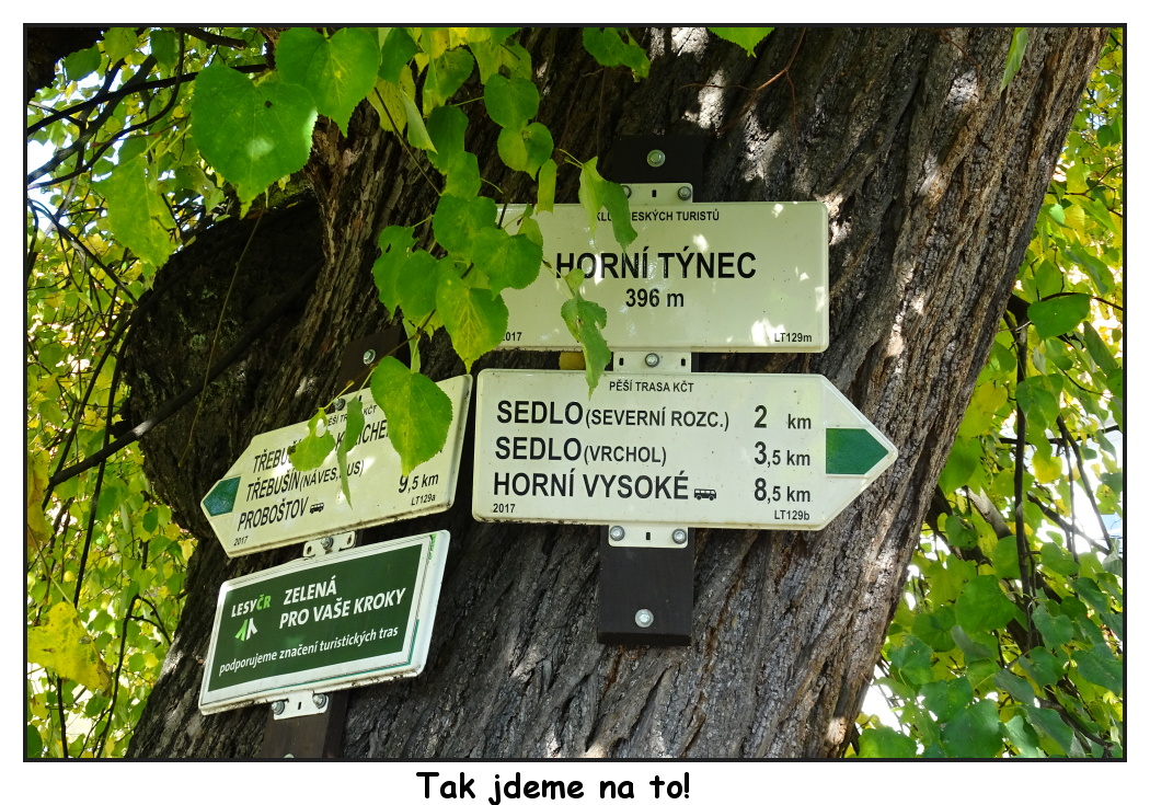 Sedlo se dá zdolat turistickými trasami z několika míst. Na radu zkušené turistky jsem si vybrala tu nejjednodušší. Autobus z Litoměřic mě vysadil ve vsi Horní Týnec. Autobusovou zastávku míjí zelená turistická značka. Vede chvíli po silnici. Sebrala jsem si sladkou hrušku, potkala se s koníky na pastvě i barevnou sojkou. Zakrátko jsem vstoupila do lesa, který jsem neměla hned tak opustit.