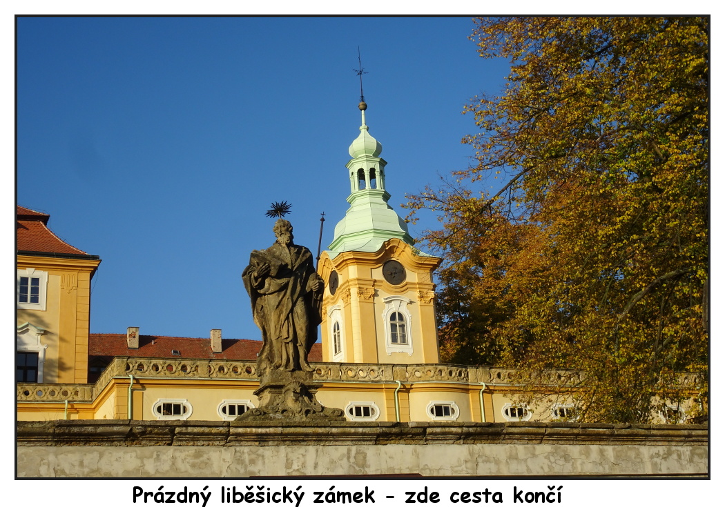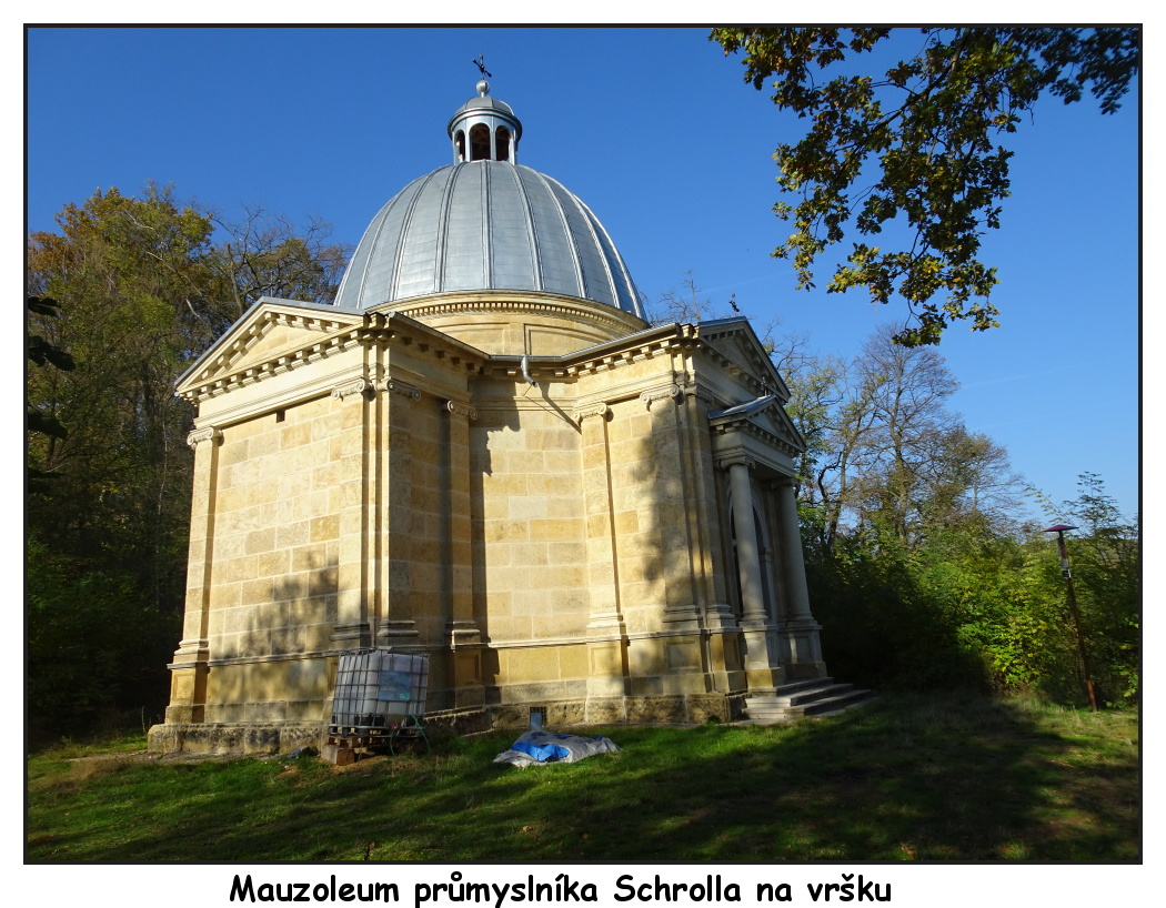 Výlet jsem si protáhla ještě o návštěvu mauzolea, shlížícího z malého vršku do krajiny. Na konci 19. století jej nechal zbudovat broumovský velkopodnikatel v textilním průmyslu Josef Edler Schroll. Ten byl posledním majitelem liběšického panství a v krásně opravené hrobce spočívá spolu se členy jeho rodiny. A právě Liběšice s autobusovou zastávkou u zámku byly poté, co jsem prošla ještě Hradcem, Srdovem a Trnobrany místem, kde jsem nastoupila do autobusu, který mě dovezl zpátky domů.