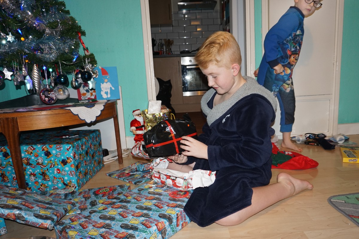 „Kde je Santa?“ ptám se a Sammy ukazuje na stopy, které doslova svítí bíle na koberci. Nejprve rozbalili dárky z punčochy a potom se vrhli ke stromečku. Probírali se dárky a rozdávali je. Radost byla veliká, jako asi u všech dětí.