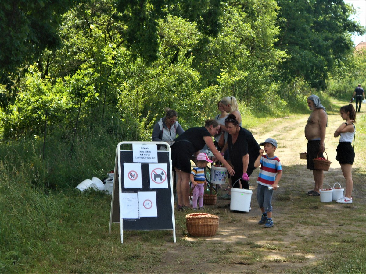 Jako každý rok si nenechám ujít tuto oblibu - samosběr jahod. Jahody mám moc ráda, tak tedy vyrážíme, do lesů, vod a strání, téměř na Šumavu. Máme s tím spojen i takový výlet, řidič odpočívá při nealko pivku či kávě a my "sokolíci" jdeme trhat. Jsou velké, pěkné, málo sladké, jde to celkem rychle. Vždy jednu řadu dva proti sobě, uličky jsou široké a srandy je také dost. Jsou zde sběrači z různých vesniček a měst. Chlapi lezou po kolenou a říkají, co bychom pro babičku neudělali. Těší se na dort s jahodami. Děti volají, takovou velkou jahodu jsme ještě neviděly. Nebo třeba se musíte bavit, když vedle vás jde dvojice se svým řádkem a před vámi trhá váš. Tedy každou rukou z obou stran trhá do kýble, tak ho má za chvíli plný. Ale nám to nevadí, protože nedojdeme ani do konce řádku a máme natrháno. Pani pokladní nám je zváží a zaplatíme. Jdeme si odpočinout do bistra a dáváme si široko-daleko známou jejich zmrzlinu.