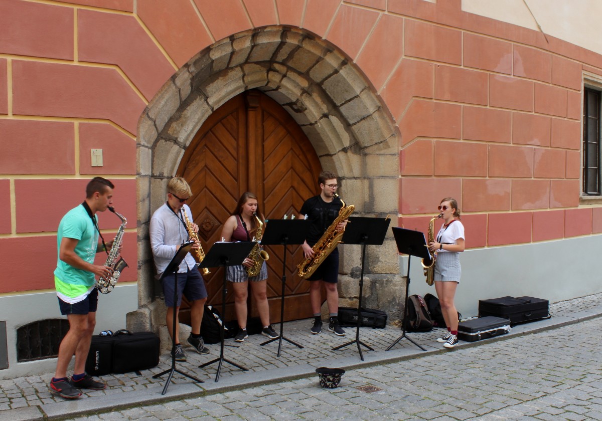 Turistů bylo málo, některé uličky i kavárničky byly prázdné. O to víc jsme se snažili nabažit tohoto krásného města, kde na vás na každém kroku dýchne kousek naší historie. Měli jsme na to skoro celý den, takže jsme nikam nespěchali a prohlídku jsme si užívali plnými doušky. Hned jsme poseděli u kafíčka, hned v zámecké, hned v klášterní zahradě nebo na náměstí jsme pozorovali rodinky s dětmi. Taky jsme měli možnost poslechnout si parádní hudební skladby v podání pětičlenného orchestru mladých muzikantů.