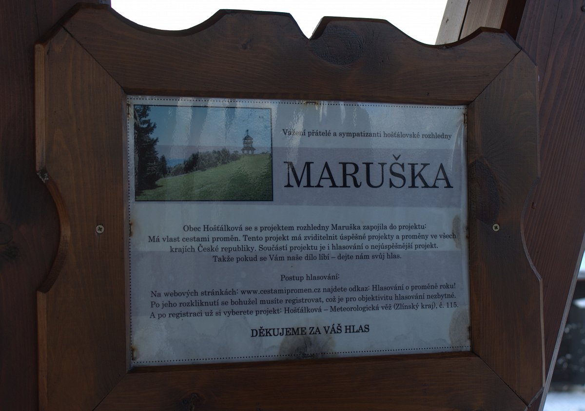 Vydali jsme se po zasněženém svahu směrem k prvnímu cíli naší cesty, k rozhledně Marušce. Výhledy na Hostýnské hory, na Čerňavu, na Kelčský Javorník byly okouzlující. Stejně tak i na druhou stranu, na Valašsko a na větší hory - Beskydy. Staré dřevěné chaloupky se krčily mezi zasněženými stromy. Rozhledna nás překvapila svou výškou, byla na rozhlednu hodně malá. Hned vedle stála meteorologická stanice se všemi stožáry a měřícími přístroji, co zaznamenávají teplotu, tlak vzduchu, rosný bod.... Dřevěné schody nahoru na rozhlednu byly hodně úzké a namrzlé, takže, hlavně cesta dolů, byla cesta tzv. o život. Výhledy do kraje však stály za to riskování.