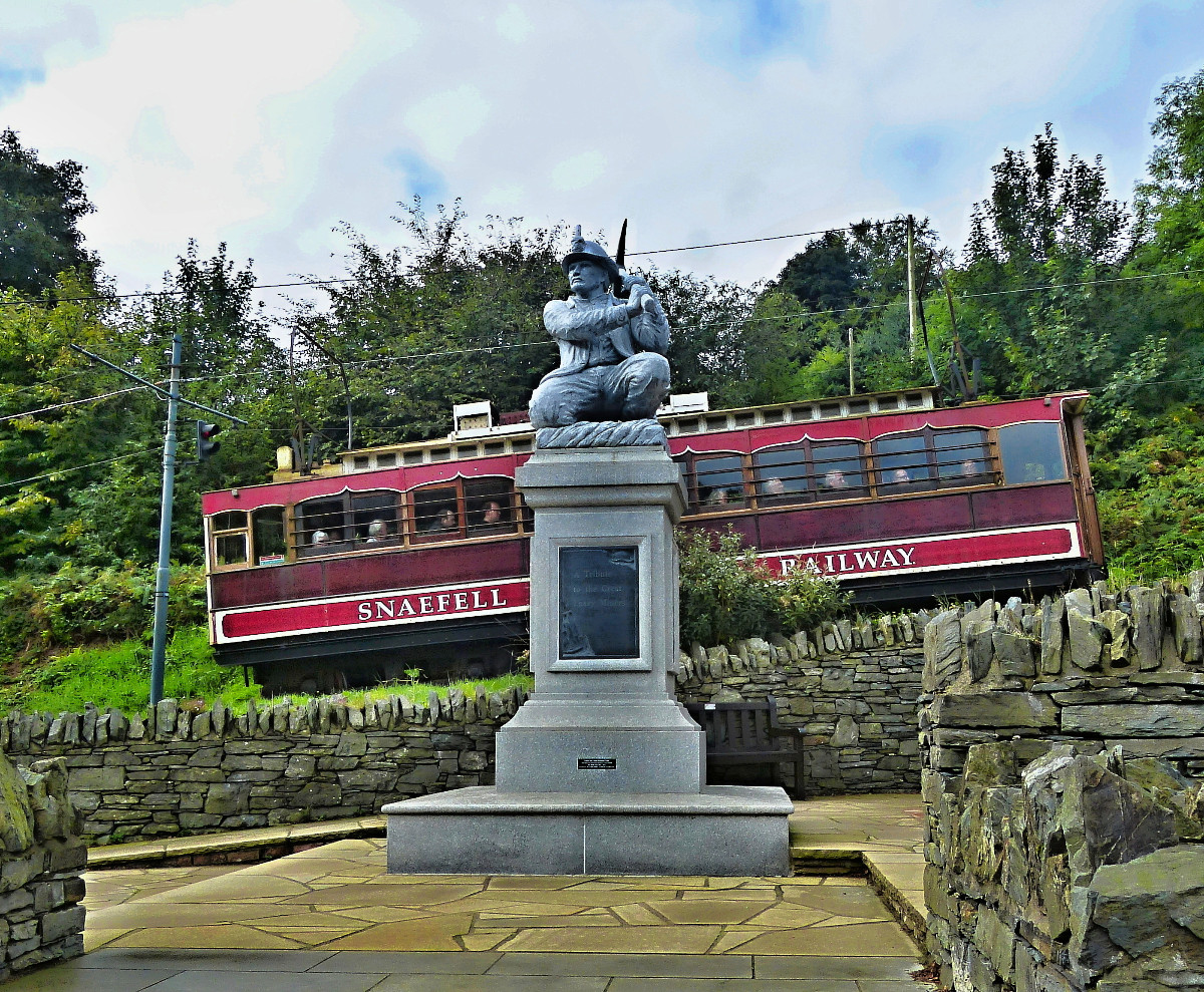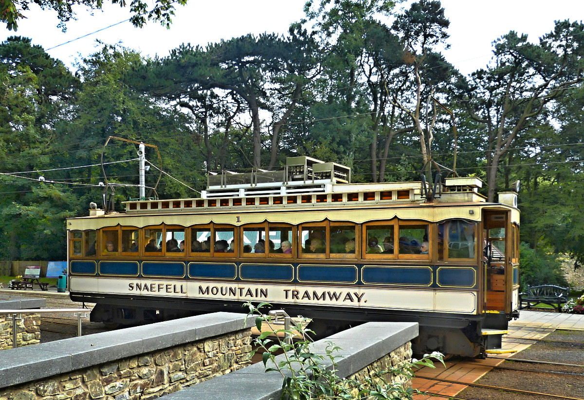 Nádraží v Laxey. Laxey leží na trati Manx Electric Railway, historické trati, která vede 17 mil podél pobřeží mezi městy Douglas a Ramsey. Stanice je také jižním terminálem Snaefell Mountain Tramway, která překonává pět mil mezi Laxey a vrcholem nejvyšší hory ostrova Snaefell, na který jsme se hodlali vydat. V pokladně jsme si za 16 liber zakoupili jízdenky a čekali na příjezd tramvaje, která nás tam měla odvézt. Na nějaké jízdní řády si zde moc nehráli, ale příslušný vůz se po nějaké době skutečně dostavil a my jsme do něj nastoupili.