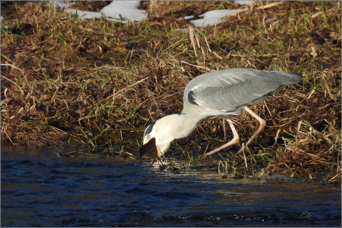 Rybáři se o úlovky  nedobrovolně dělí s vodními ptáky. Ptáci vyhrávají na celé čáře. Volavky popelavé, kormoráni a racci, to jsou ti velcí, k nim se přidávají morčáci velcí a kachny divoké. Řeka Bělá je jich tuto zimu plná, až bych řekla, že je na ní poněkud těsno. Vzácně se objeví i ledňáček říční, taky rybář. Mám z toho ptačího světa na řece nefalšované potěšení.