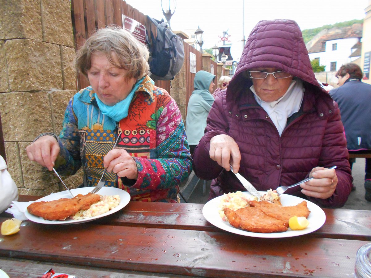 Děvčata si dala k jídlu "sloní ucho" s bramborovým salátem. To tedy byl dvojitý právě smažený řízek.