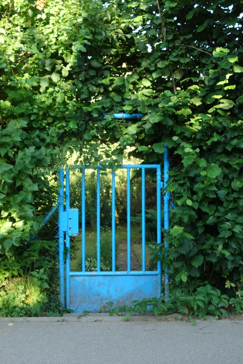 Jdeme dál,....Cesta není moc široká, ale slouží jako cyklostezka. Občas někdo běží, jede na kole. Bruslaři a maminky s kočárky asi ještě spí, je teprve 7 hodin. Nakukuji do zahrádek. Tu je modrá chatička, tu modrá vrátka, sud na vodu, hrábě.