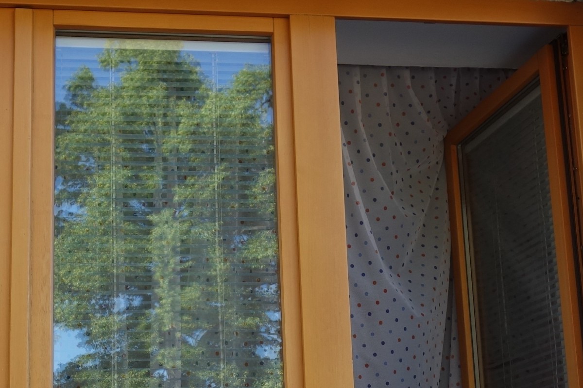 Blížíme se k Sokolovně, kde je na zdi pěkná malůvka a míříme od řeky zpět do sídliště kolem několika hospůdek. Jednu hyzdí na fasádě reklama na RADIO SIGNÁL  To úplně nesnáším, teda tu reklamu.  Začíná být vedro, jdeme kolem otevřených oken rodinných domků. V jednom vidím pěknou puntíkatou záclonu.