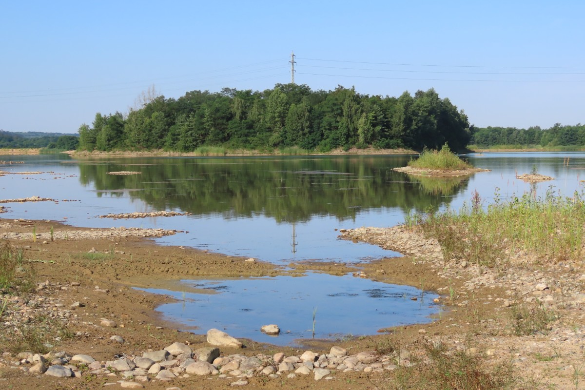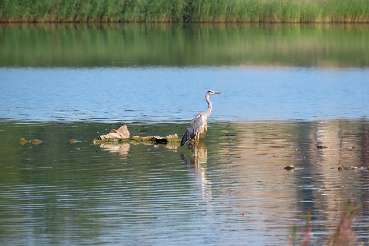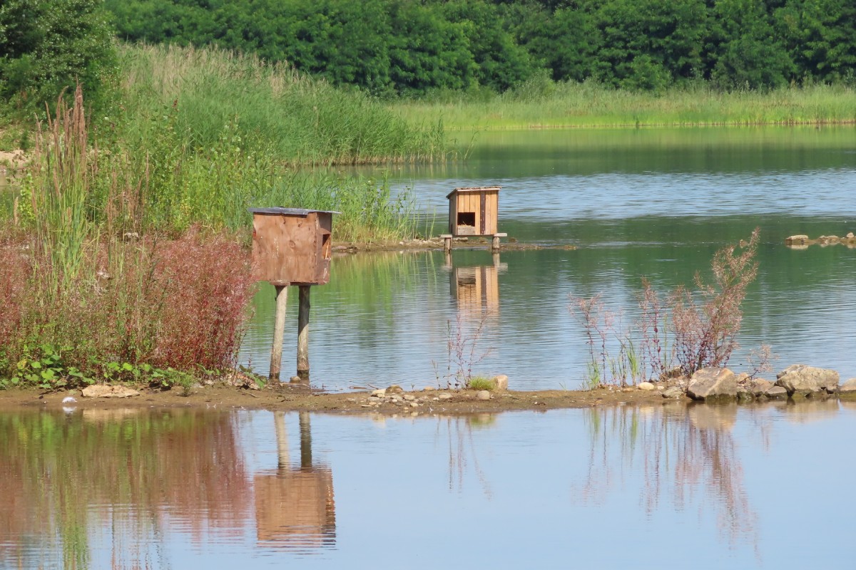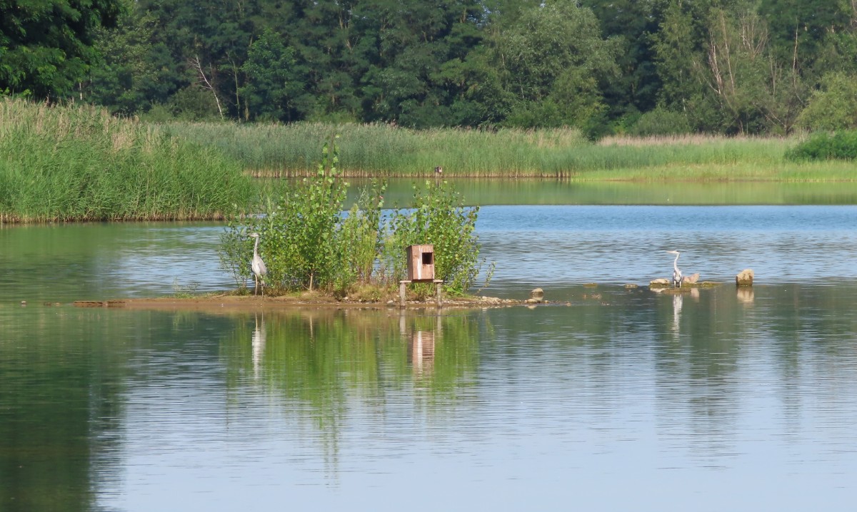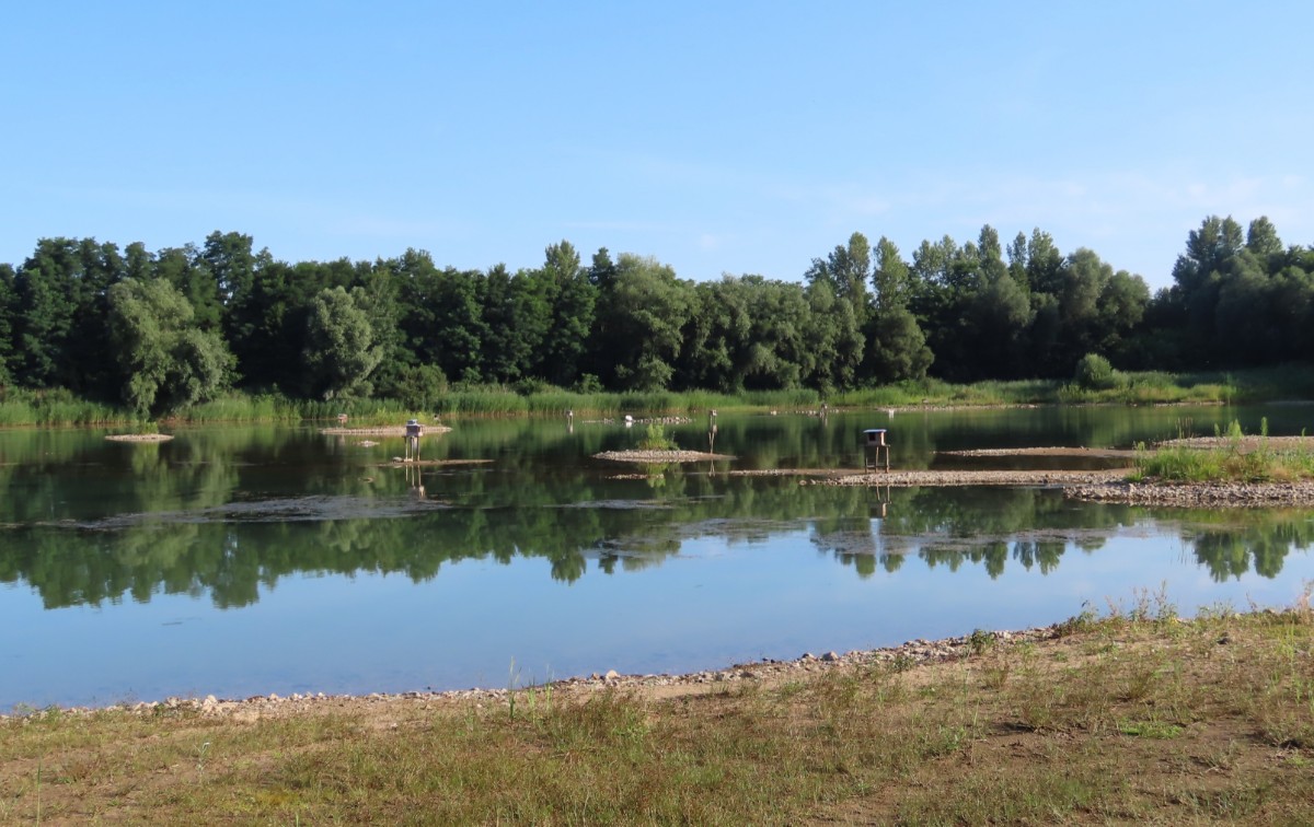 Pokračuji dál kolem míst, kde je o trochu větší hloubka a lidé se sem ještě chodí koupat. V tuto denní dobu tu však není ani živáčka. Pomalu se blížím k sousednímu jezeru, po poklesu vody rovněž náležejícímu výhradně vodnímu ptactvu. I zde mají k dispozici dřevěná obydlí. Jestli je využívají, to nevím. Rybáky i husice jsem vždycky viděla sedět na stříškách. Rybáci jsou tu i dneska. A k mé velké radosti i zahnízdili a mládě se má čile k světu. Jako rybáři trpělivě čekající na úlovek postávají v mělké vodě volavky s prstýnky na nohou.