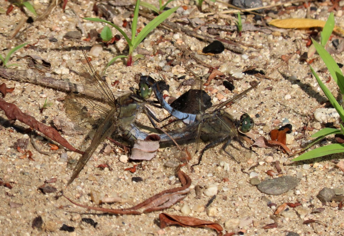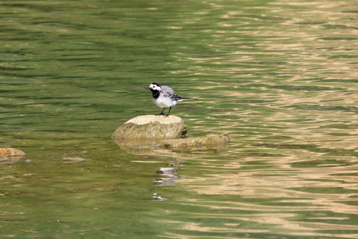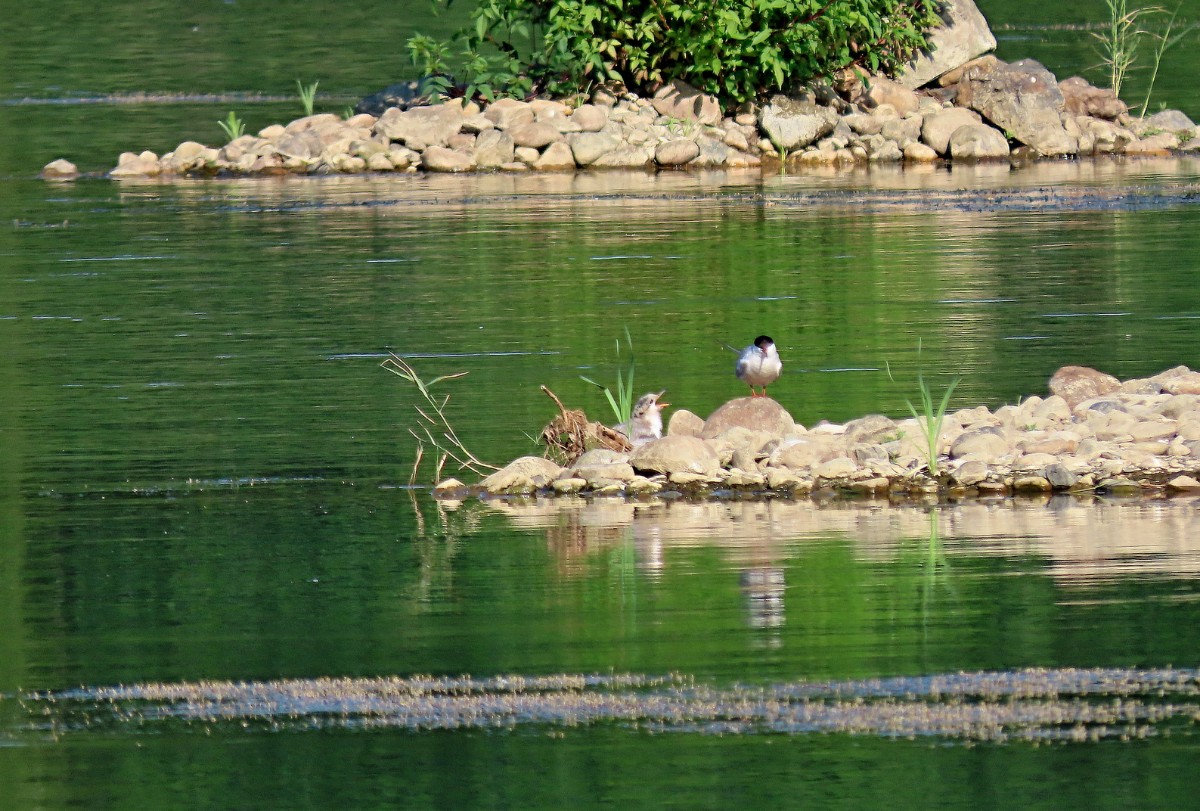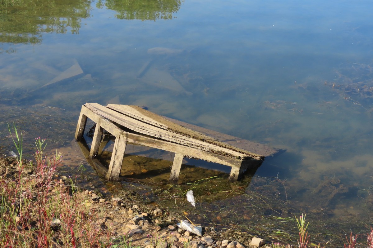 Pokračuji dál kolem míst, kde je o trochu větší hloubka a lidé se sem ještě chodí koupat. V tuto denní dobu tu však není ani živáčka. Pomalu se blížím k sousednímu jezeru, po poklesu vody rovněž náležejícímu výhradně vodnímu ptactvu. I zde mají k dispozici dřevěná obydlí. Jestli je využívají, to nevím. Rybáky i husice jsem vždycky viděla sedět na stříškách. Rybáci jsou tu i dneska. A k mé velké radosti i zahnízdili a mládě se má čile k světu. Jako rybáři trpělivě čekající na úlovek postávají v mělké vodě volavky s prstýnky na nohou.