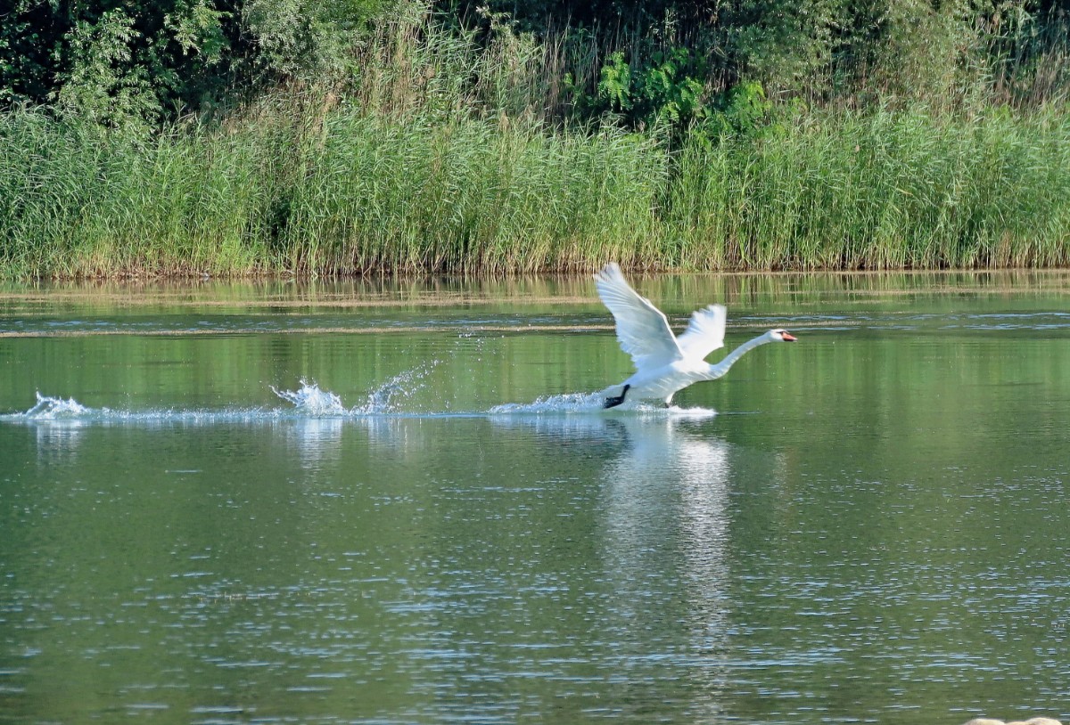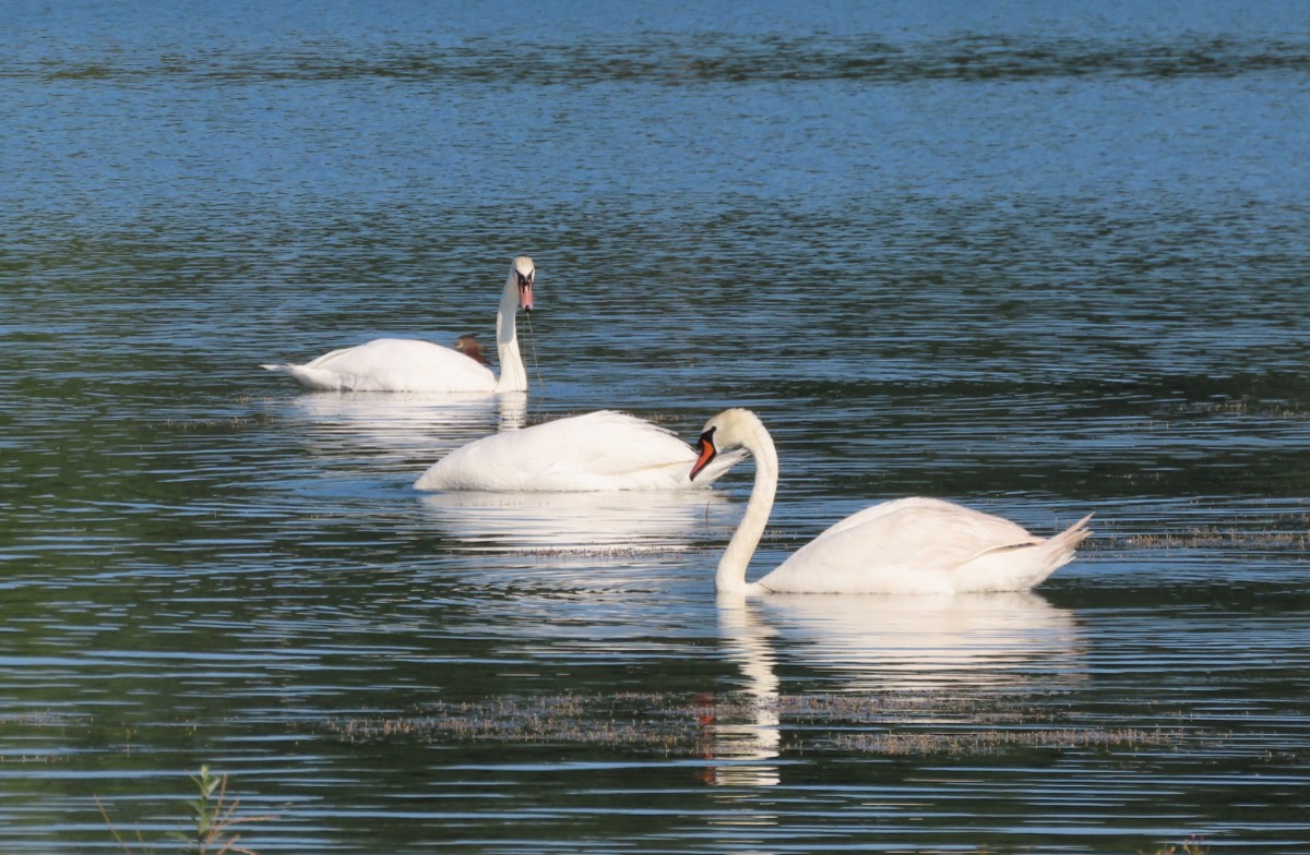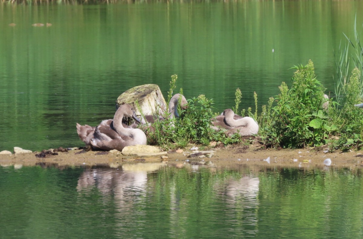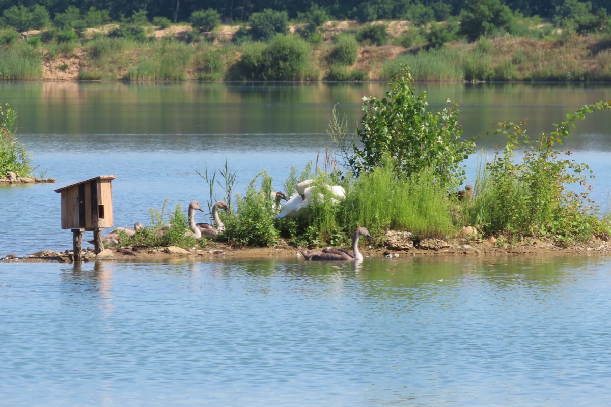 Dnešní ráno je tiché, klidné a modravé nebe slibuje letní den jako víno. Tráva je ještě plná rosy, avšak na vršcích divizen se žlutými květy ve výšce mých očí se už činí včelky. Divizen je letos opravdu hodně, a když opatrně obírám květy do jednoho z pohotovostních sáčků ve stylu "vždy buď připravená", včelky si úbytku ani nevšimnou. To už se blížím k nejzazšímu konci jezera, vyhrazenému ptačímu světu. Voda v jezerech zřejmě díky pokračující těžbě a zvětšování plochy zřetelně ubývá. Z vody vystupují ostrůvky a plavat by se tu rozhodně nedalo. Všechno zlé je pro něco dobré a sem se začali stahovat vodní ptáci. Loni tu pro ně ornitologové nainstalovali dřevěné budky. Vydržím se loudat těsně při hranici vody a očima za pomoci fotoaparátu sleduji vodní hladinu i ostrůvky a hledám, kde se co šustne. Voda je dnes hladká jako zrcadlo a ani se nepohne. Ticho rozrazil zvuk mávajících křídel a už vidím startující labuť. Vznesla se z vody jakoby nic a přistála o kousek dál. Na jednom z ostrůvků přenocovala labutí rodinka se čtyřmi mláďaty. Pomalu se probouzejí a probírají k životu plnému učení a shánění potravy. Labuťátka už jsou pěkní dorostenci. Jestlipak se uvidím i s druhou rodinkou, která na pískovně přebývá? Medituji si pro sebe a jdu dál. V povzdálí se objevilo hejno labutí, pomalu se projíždějících po vodě. Někdy jich tu bývá i přes třicet, ale dneska jich tolik není. Hlavy ponořují pod vodu a tahají z ní vodní rostliny, kterými se živí. Jsem potichu jako myška, takže o mně pravděpodobně vůbec nevědí.