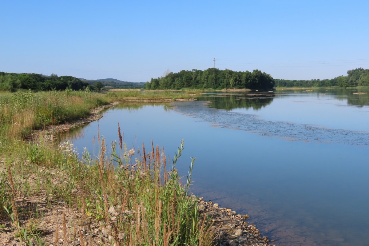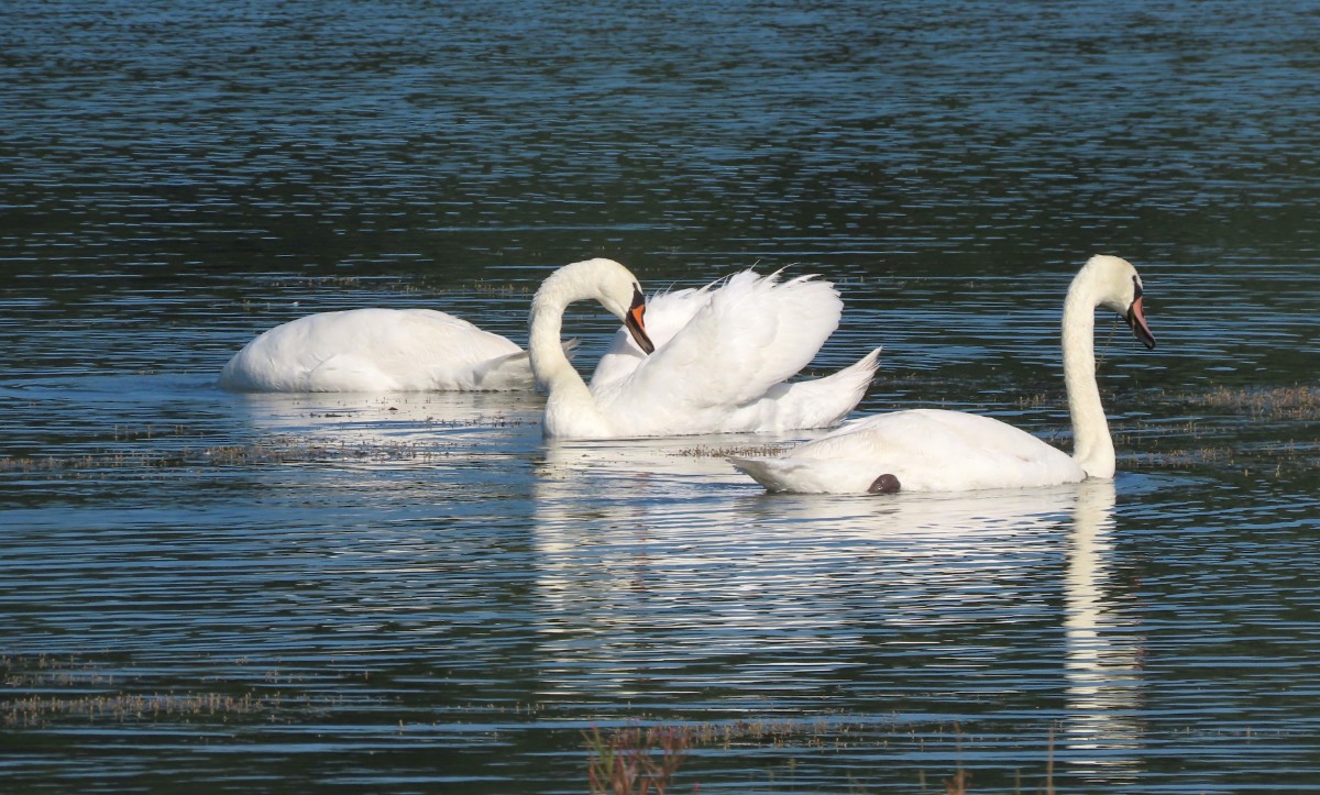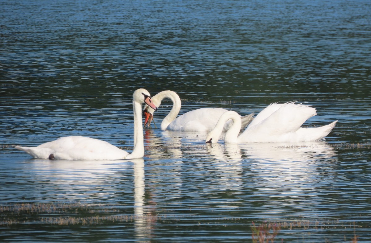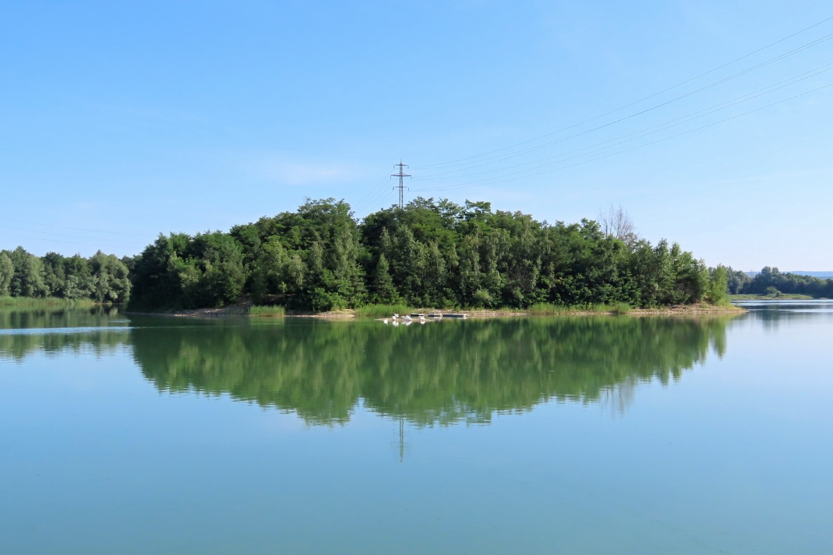 Dnešní ráno je tiché, klidné a modravé nebe slibuje letní den jako víno. Tráva je ještě plná rosy, avšak na vršcích divizen se žlutými květy ve výšce mých očí se už činí včelky. Divizen je letos opravdu hodně, a když opatrně obírám květy do jednoho z pohotovostních sáčků ve stylu "vždy buď připravená", včelky si úbytku ani nevšimnou. To už se blížím k nejzazšímu konci jezera, vyhrazenému ptačímu světu. Voda v jezerech zřejmě díky pokračující těžbě a zvětšování plochy zřetelně ubývá. Z vody vystupují ostrůvky a plavat by se tu rozhodně nedalo. Všechno zlé je pro něco dobré a sem se začali stahovat vodní ptáci. Loni tu pro ně ornitologové nainstalovali dřevěné budky. Vydržím se loudat těsně při hranici vody a očima za pomoci fotoaparátu sleduji vodní hladinu i ostrůvky a hledám, kde se co šustne. Voda je dnes hladká jako zrcadlo a ani se nepohne. Ticho rozrazil zvuk mávajících křídel a už vidím startující labuť. Vznesla se z vody jakoby nic a přistála o kousek dál. Na jednom z ostrůvků přenocovala labutí rodinka se čtyřmi mláďaty. Pomalu se probouzejí a probírají k životu plnému učení a shánění potravy. Labuťátka už jsou pěkní dorostenci. Jestlipak se uvidím i s druhou rodinkou, která na pískovně přebývá? Medituji si pro sebe a jdu dál. V povzdálí se objevilo hejno labutí, pomalu se projíždějících po vodě. Někdy jich tu bývá i přes třicet, ale dneska jich tolik není. Hlavy ponořují pod vodu a tahají z ní vodní rostliny, kterými se živí. Jsem potichu jako myška, takže o mně pravděpodobně vůbec nevědí.