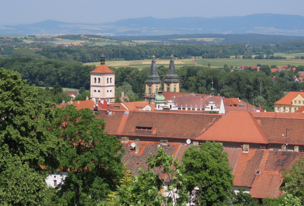 Nápad pozvat zájemce do „mého“ města se mi v hlavě vylíhl při prvním velkém a úspěšném "pokovidovém" setkání v Prokopském údolí, vyhlášeného redakcí i60. A bez meškání jsem ho také přednesla zúčastněným a posléze vyhlásila na webu. Připravila jsem program podle mého nejlepšího svědomí, netušila jsem však, že hlavní bod - prohlídku zámku – budeme muset vypustit. Záměr nám totiž zhatili filmaři, kteří zámek zrovna obsadili a měli samozřejmě přednost. Nám to nakonec vlastně ani nevadilo. 17. červen připadl zrovna na jeden z mála opravdově letně horkých dnů letošního léta. Pokusila jsem se vést naši skupinku tak, abychom se přímému slunci pokud možno vyhýbaly.