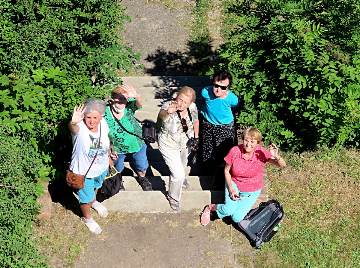 Na nádraží přivezly vlaky Jitku, Jarku, Marušku, Olinku a Helenu, bylo nás tedy šest. Prohlídku města jsme zahájily v našem novém a pěkném infocentru, kde si jednak děvčata odložila batohy a jednak jsme si prohlédly výstavu obrazů australského malíře Lukose Hey „New Visions – Roudnice nad Labem 2021“. Odtud jsme se vydaly na městskou hlásku. Tato bílá věž s vyhlídkovým ochozem je jediným pozůstatkem opevnění staré Roudnice. Obhlédly jsme město pěkně z výšky a pomalu se blížil čas oběda. Už se stalo zvykem, že všechny návštěvy vodím do Zámecké restaurace a tento zvyk nebyl porušen ani tentokrát. S plnými bříšky jsme pokračovaly k rozhledně. Ano, ve městě, přesněji řečeno malý kousíček nad ním, máme v parku rozhlednu. Ta se směle může řadit k raritám, protože s nadmořskou výškou 230 m se řadí k nejníže položeným rozhlednám u nás. Děvčata mohou potvrdit, že výhled z ní na město se zámkem a věžemi i České středohoří na obzoru stojí za trochu námahy. Pohled na druhou stranu k Řípu bohužel časem vzal úplně za své. Z rozhledny jsme se vrátily dolů do města a zaslouženě se usadily ve známé kavárně Dortletka.
