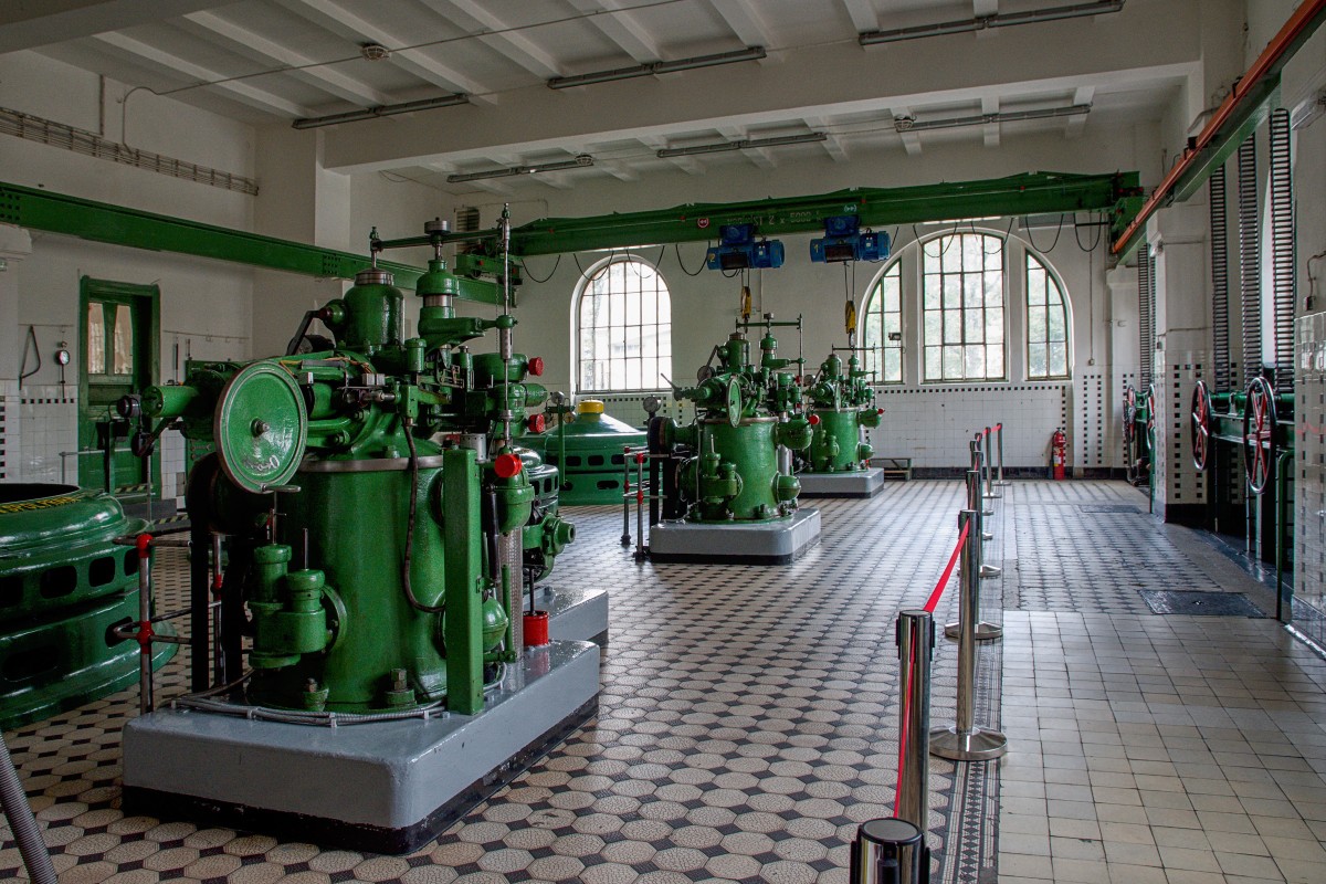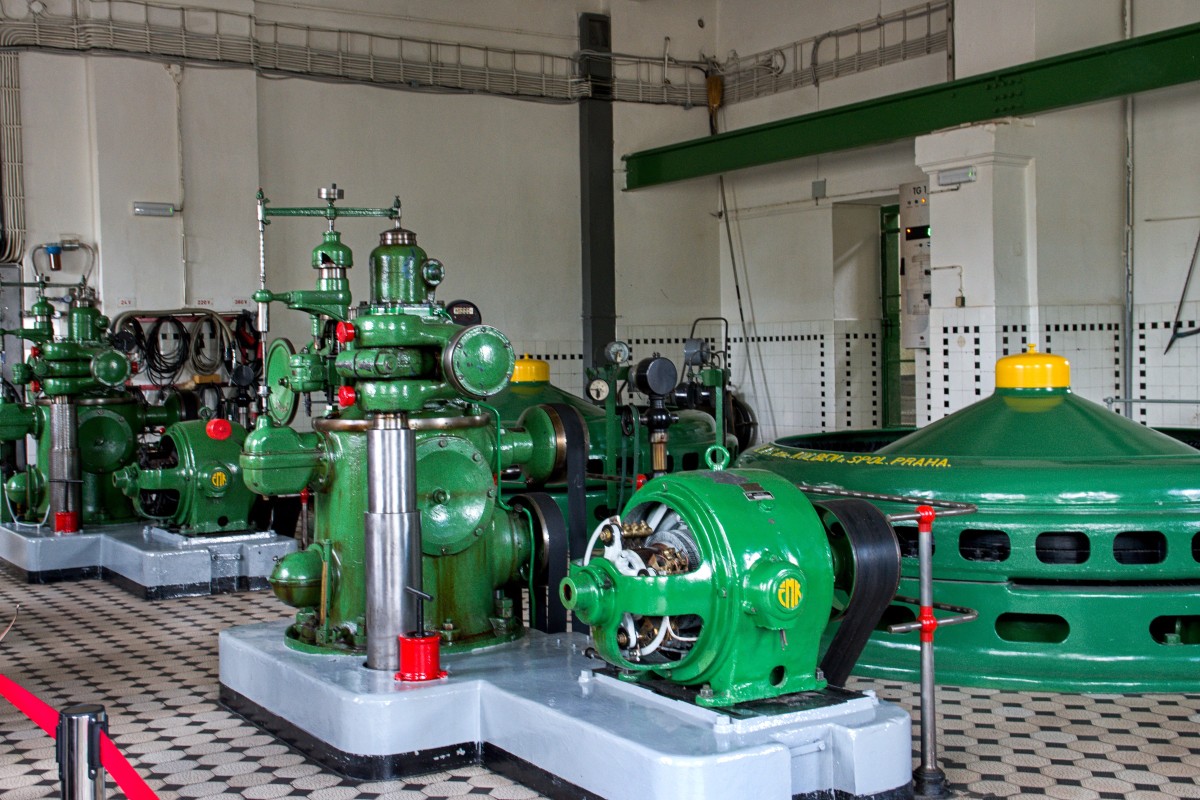 Pohled do strojovny elektrárny - prakticky vše včetně obkladů i dlaždic je původní.