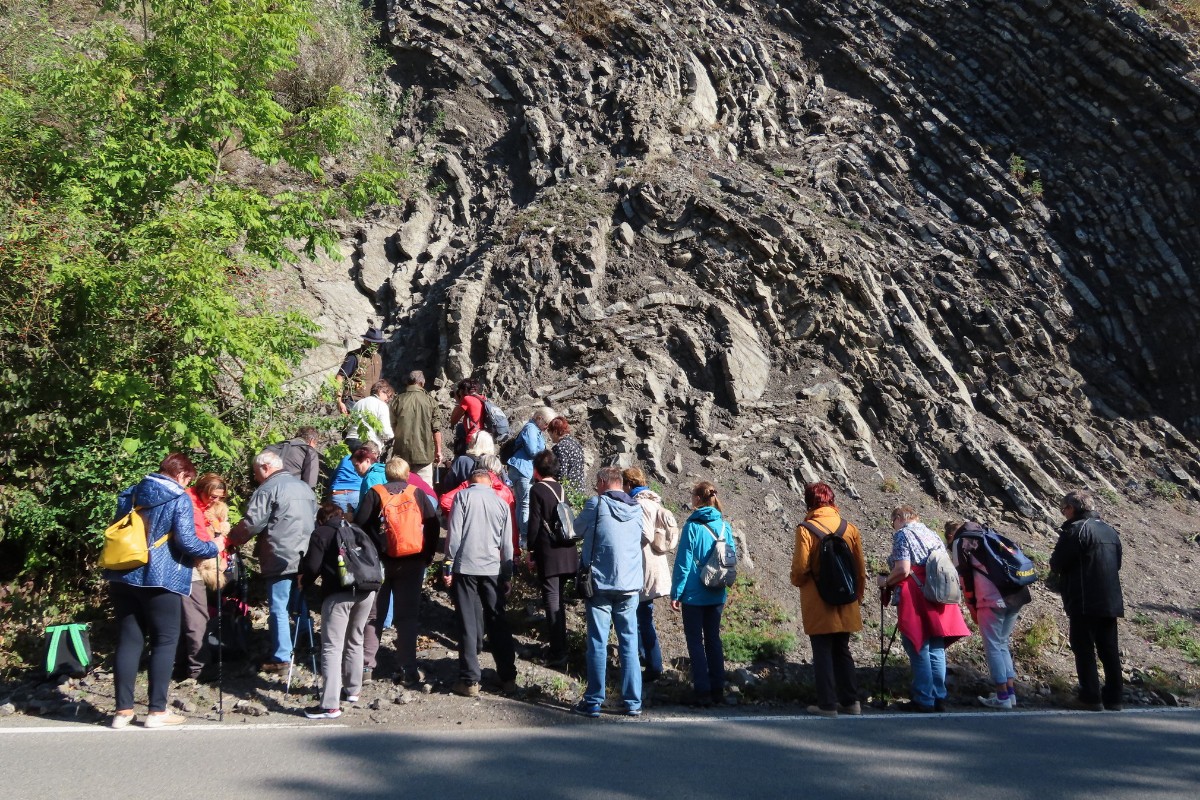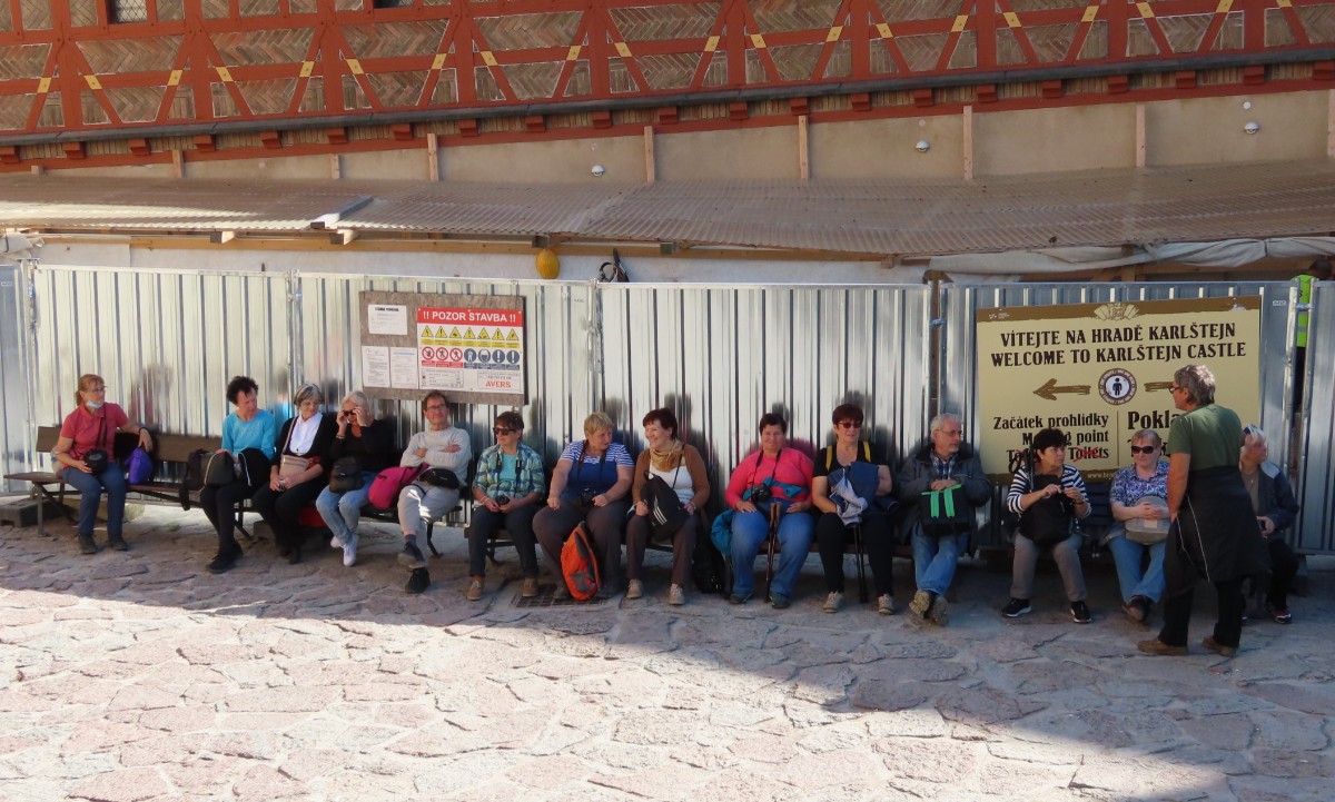 Čtvrtek nás přivítal nádhernou oblohou se sluníčkem a celá tlupa se natěšeně vydala na nádraží. Dnešní výlet nebude auty, ale pojedeme vláčkem! Těšili jsme se a vesele ujeli dvě stanice do Karlštejna. Před nádražím už na nás čekal průvodce dopolední vycházkou, sympaťák, do kterého jsme se svorně a bleskově zamilovaly, geolog Štěpán Rak, takto syn známého kytaristy. Jak on dovede vyprávět o něčem tak obyčejném jako je chodník, to je neuvěřitelné. Všichni jsme s geologickými kladívky v rukou zírali pod nohy a dychtivě naslouchali vyprávění o časech, které ani nejstarší účastník setkání nepamatuje. Vždyť procesy, které formovaly naši zemi, se odehrávaly před nějakými 420 milióny lety. Ve štrůdlu jsme se dostali na druhou stranu řeky ke skále u silnice, která se proslavila v celém geologickém světě. Právě tady se podařilo objevit a prokázat místo, kde je hranice mezi dvěma geologickými obdobími - siluru a devonu. Znalci mou laickou informaci opraví, doplní, upřesní. Pan Rak vytáhl z batohu živočichy, kteří se tu v pra pra pradávnu proháněli, zhynuli a dočista zkameněli, a my jsme také poněkud zkameněli po informaci, že na okraji skály si nějakého takového můžeme i najít. Rychle jsme se vzpamatovali, zapomněli na bolavá kolena a vrhli se do sutě. Za pomoci půjčených kladívek jsme dychtivě proklepávali a prohrabávali kamení a žasli a žasli. Je někdo, kdo si nějakou tu zkamenělinu neodnesl? Já myslím, že ne. Tento bod programu u mě jasně vyhrál a jsem za nápad s geologickou vycházkou Honzovi moc a moc vděčná.