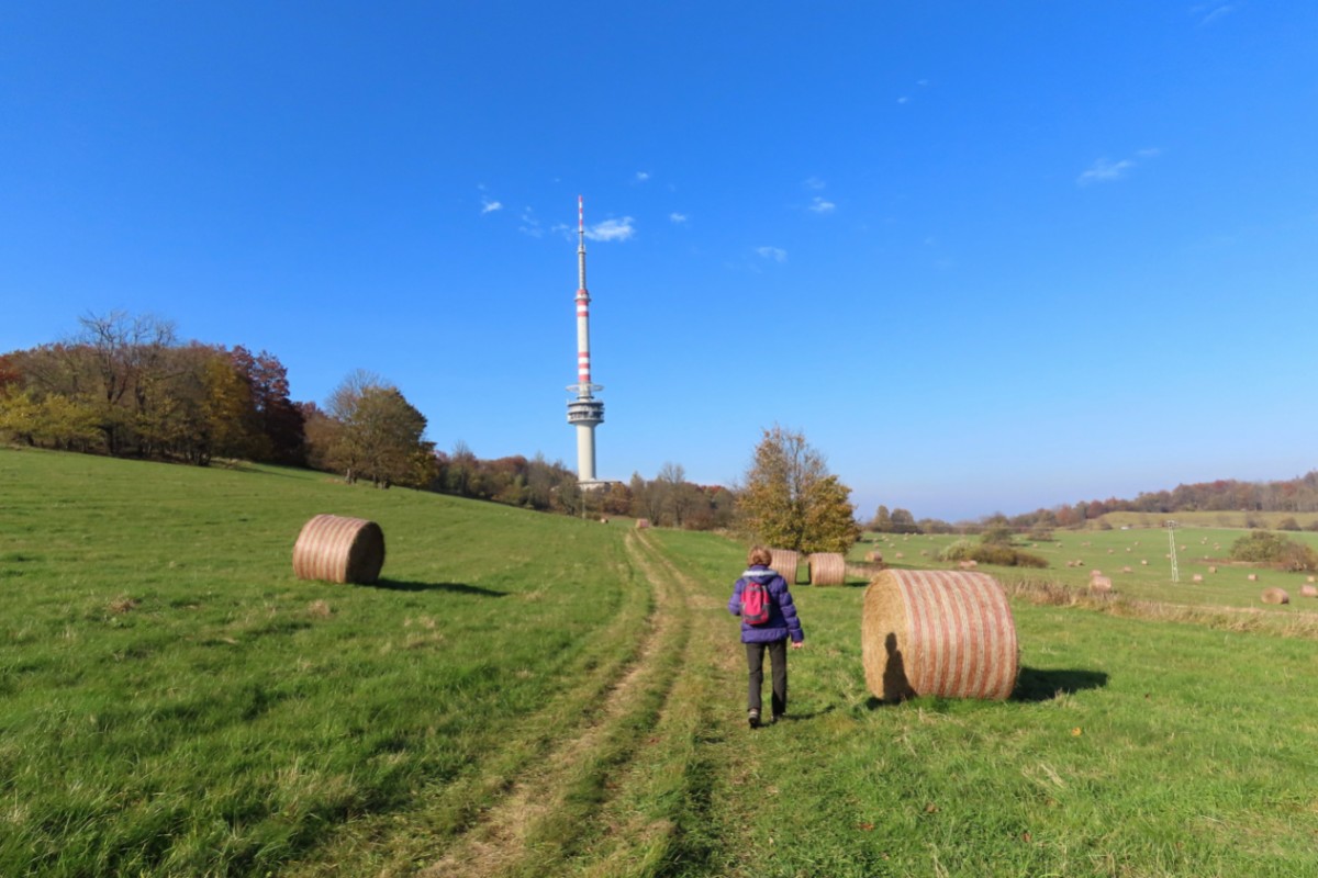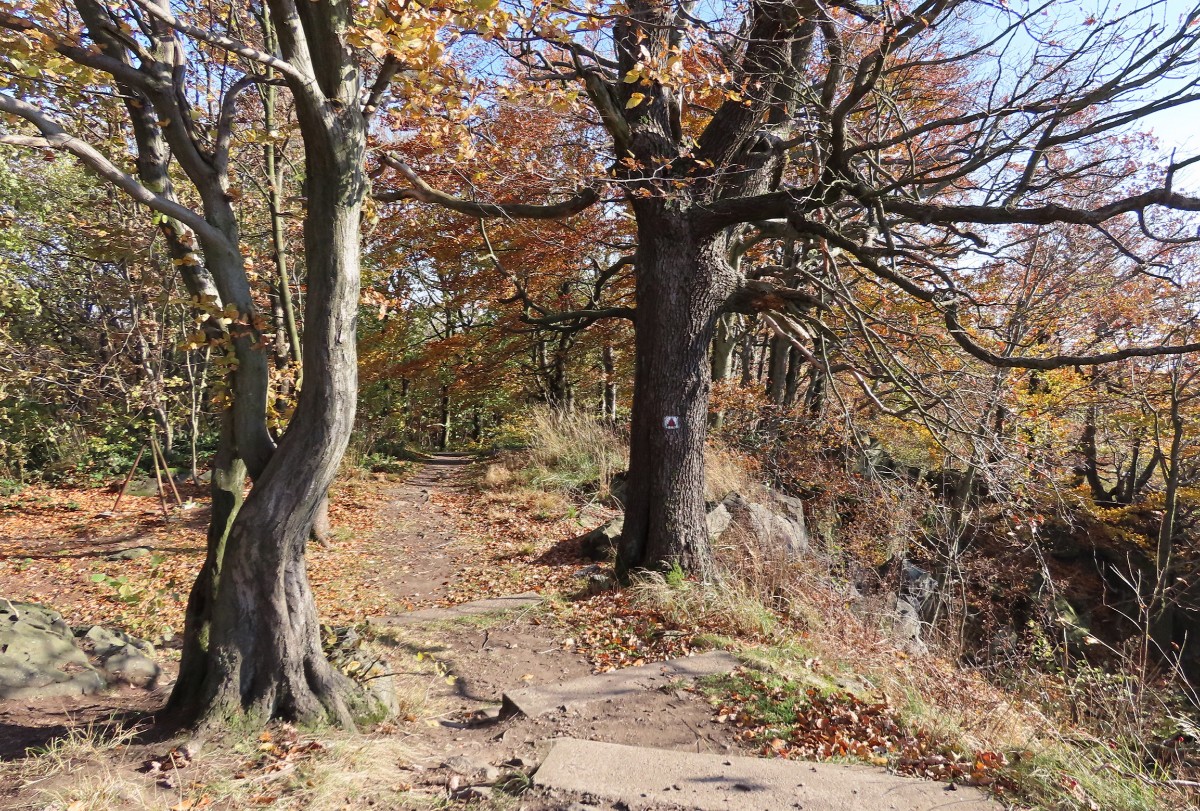 Za nezvykle na toto roční období krásného dne jsme se s kamarádkou na Bukovou horu vydaly. Na start výletu nás dovezl autobus. Ačkoliv slunko svítilo i příjemně hřálo, ve vzduchu se tetelil opar a výhledy na České středohoří se moc nekonaly. Nám to ale vůbec nevadilo a vykračovaly jsme si spokojeně podzimně zbarvenou přírodou. Zdálo se, že vysílač máme na dosah. Pokud byste se rozhodli pro tuto vycházku, vězte, že od rozhledny k vysílači to je 6 km. Cestu snadno zvládnou i děti, vede po hřebeni bez velkého převýšení.
