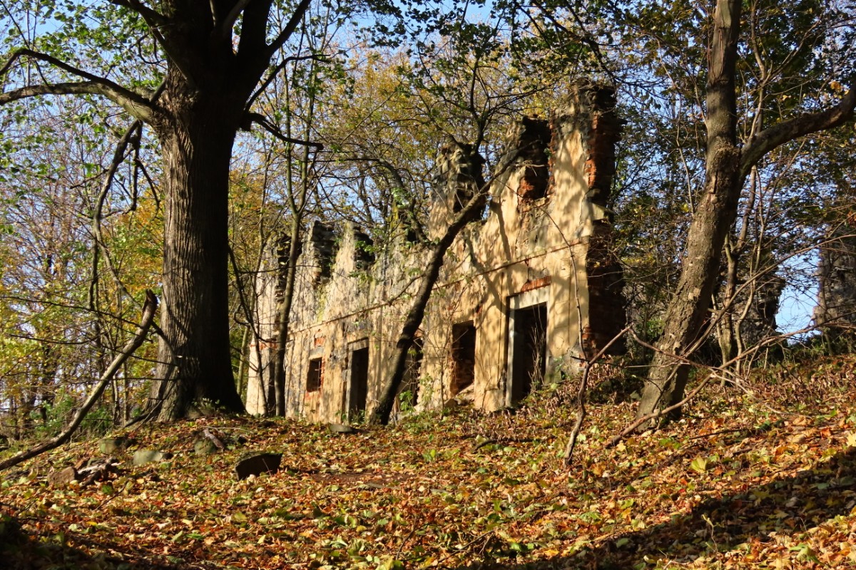 Ze skalnaté vyhlídky jsme se pokochaly výhledem po proudu Labe směrem k Ústí nad Labem. Čekala nás cesta po úbočí hory dolů do Zubrnic. Vybraly jsme si zelenou turistickou značku a vydaly se dolů po svahu. Buková hora, vysoká 683 m, má přiléhavý název, cesta vedla podzimně barevným bukovým lesem. Spadané listí nám šustilo pod nohama a slunko prosvítalo skrz zbylé listy, úporně se zatím držící na větvích. Prošly jsme zaniklou obcí Velké Stínky, ze které mezi stromy zůstalo pár kamenných náznaků, že tu stály domy a v nich žili lidé. Do dnešních dnů je u ní stará lípa, památný strom, značně poznamenaný stářím. Vysílač už jsme dávno měly nad sebou a pokračovaly stále dolů. Doslova nás přimrazil výjev mezi stromy. Zaniklá samota Mauerschin. Mezi nádhernými stromy se vynořila jako výjev z hororu. Zeď s dírami po oknech a dveřích a za ní ve stínu jen pár rozvalin … Nemohly jsme se odtrhnout a jen neochotně jsme se pustily dál.