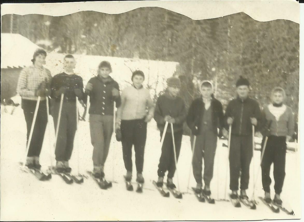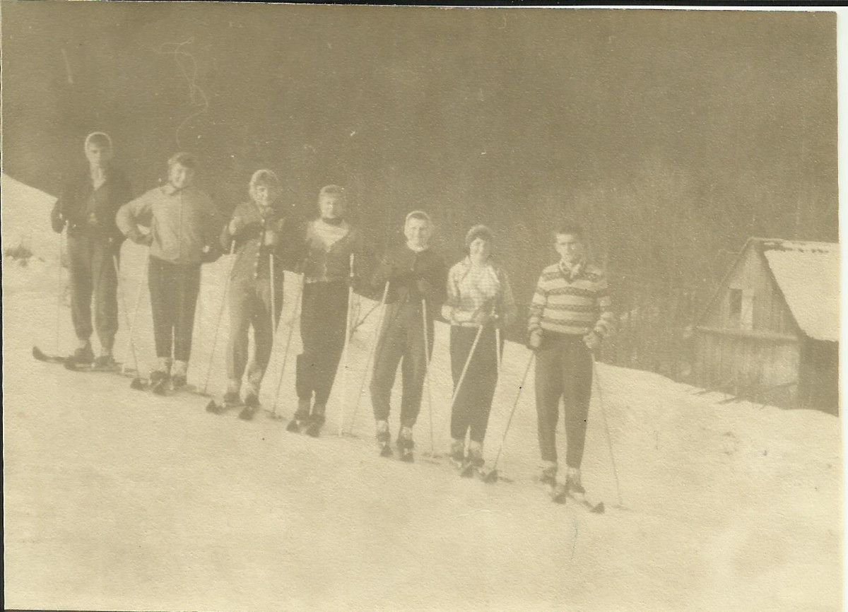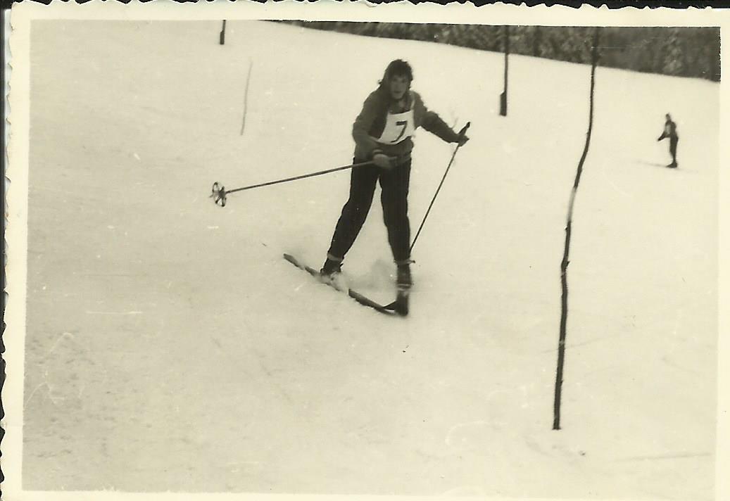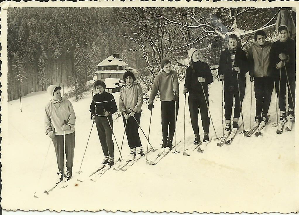 Ale užívali jsme si všichni sněhových radovánek, jak ukazuji na fotečce z 50tých let. Tehdy jsem jezdila na obyčejných lyžích, vázání bylo řemínkové, a když se mi řemínek přetrhl, tak jsem si ho klidně "opravila" obyčejným špagátem, který jsem mívala pro jistotu v kapse. A lyžování mi šlo velmi dobře, vyhrávala jsem mnohé soutěže.