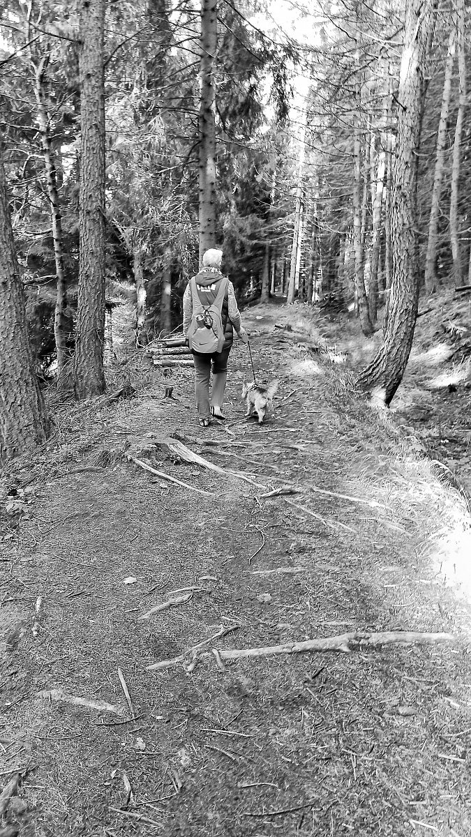 Nejvíce času trávíme v lese Ressl až u rybníka a statku, ale jezdíme i na výlety. Ten zajímavý byl na přehradě Fláje v Krušných horách, kam nás doprovázela kamarádka Jarka s fenkou Cindynkou. Měla jsem obavy, zda se Robin s fenkou bude kamarádit, protože na psy dost štěkal a hlídal si mě, ale vše dopadlo dobře. Naopak v poslední době se jeho vztah k pejskům zlepšuje a v okolí našeho domu už má dva velké kamarády. Výlet na přehradě jsme si užili. Prošli jsme se cestou Flájským plavebním kanálem, a ač tam bylo mnoho kořenů stromů a tak cesta byla trochu náročnější, byla to skvělá procházka. Jen si kladu otázku, proč jsem leckde nebyla už dávno, kdy žila ještě má maminka... Byť jsme naštěstí spolu dost cestovaly, hlavně na Šumavu i s fenkou Baruškou.
