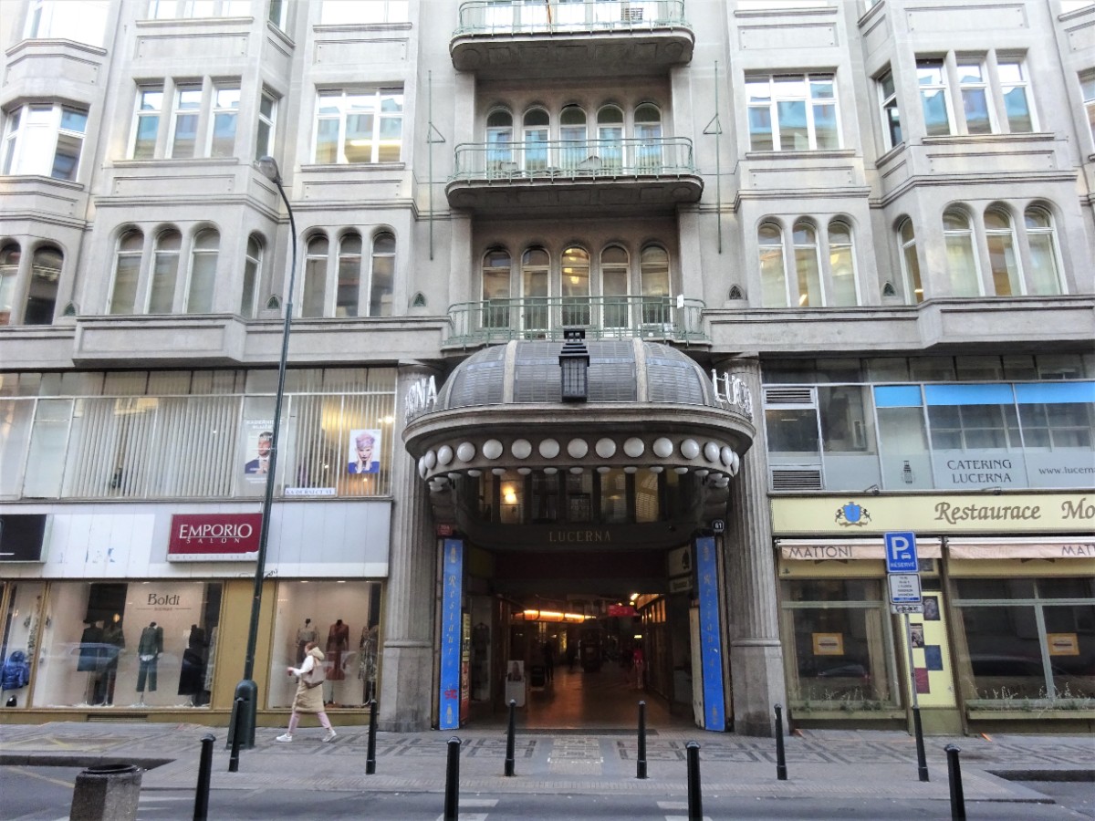 Pasáž secesního paláce Lucerna byla první pasáž v Praze. Stavba paláce začala již v roce 1907, pokračovala v několika etapách až do roku 1921. Budova je životním odkazem stavitele Vácslava Havla, dědečka bývalého prezidenta, Praze. Systém pasáží v Lucerně je pravděpodobně největší a nejzajímavější. Propojuje Vodičkovu a Štěpánskou ulici. V pasáži se nachází kino v secesním stylu, několik obchodů a barů. V atriu uprostřed pasáže visí socha výtvarníka Davida Černého – parodie na rytířský pomník sv. Václava. Lucerna je památkově chráněný komplex. V době, kdy jsem fotila, se palác zvenku opravoval, byl přikryt plachtou. Fotografie vchodu do pasáže je proto ze Štěpánské ulice.