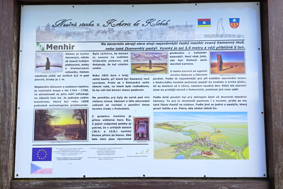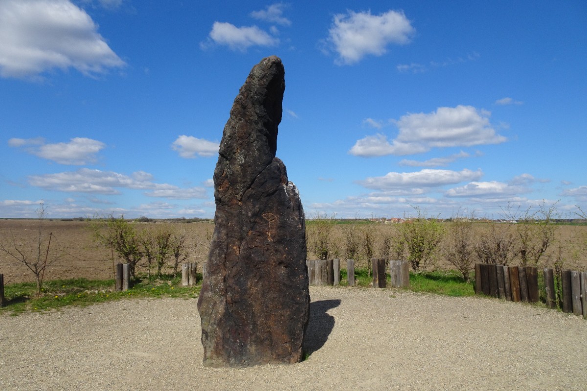 Jen asi 7 km odtud, a přece už v jiném kraji i okrese, stojí v poli u silnice mezi Klobuky a Telci zkamenělý pastýř. Kdo ví, jak dlouho už shlíží na krajinu kolem? Možná ho vztyčili Keltové, kteří tu kdysi žili. Vyznačen je ve vojenské mapě z roku 1764-68. Menhir z rezavě hnědého železitého křídového pískovce je nejvyšším menhirem v ČR . Je vysoký cca 3,5 m (z toho 70 cm je zapuštěno v zemi) a váží 5 tun. Pamatuji dobu, kdy k němu vedla od silnice jen vyšlapaná pěšina v poli. Později byla kolem něho postavena dřevěná palisáda, dnes už jaksi podléhá zubu času. Pro mě je to takové tiché místo k rozjímání. Poslední výlet k menhiru o Bílé sobotě byl doslova vnuknutím, kdy jsem zatoužila se ho dotknout. Otevřenou krajinou se za slunečního svitu proháněl studený vítr a menhir - zkamenělý pastýř byl na dotek příjemně teplý a zahřál moje smysly.