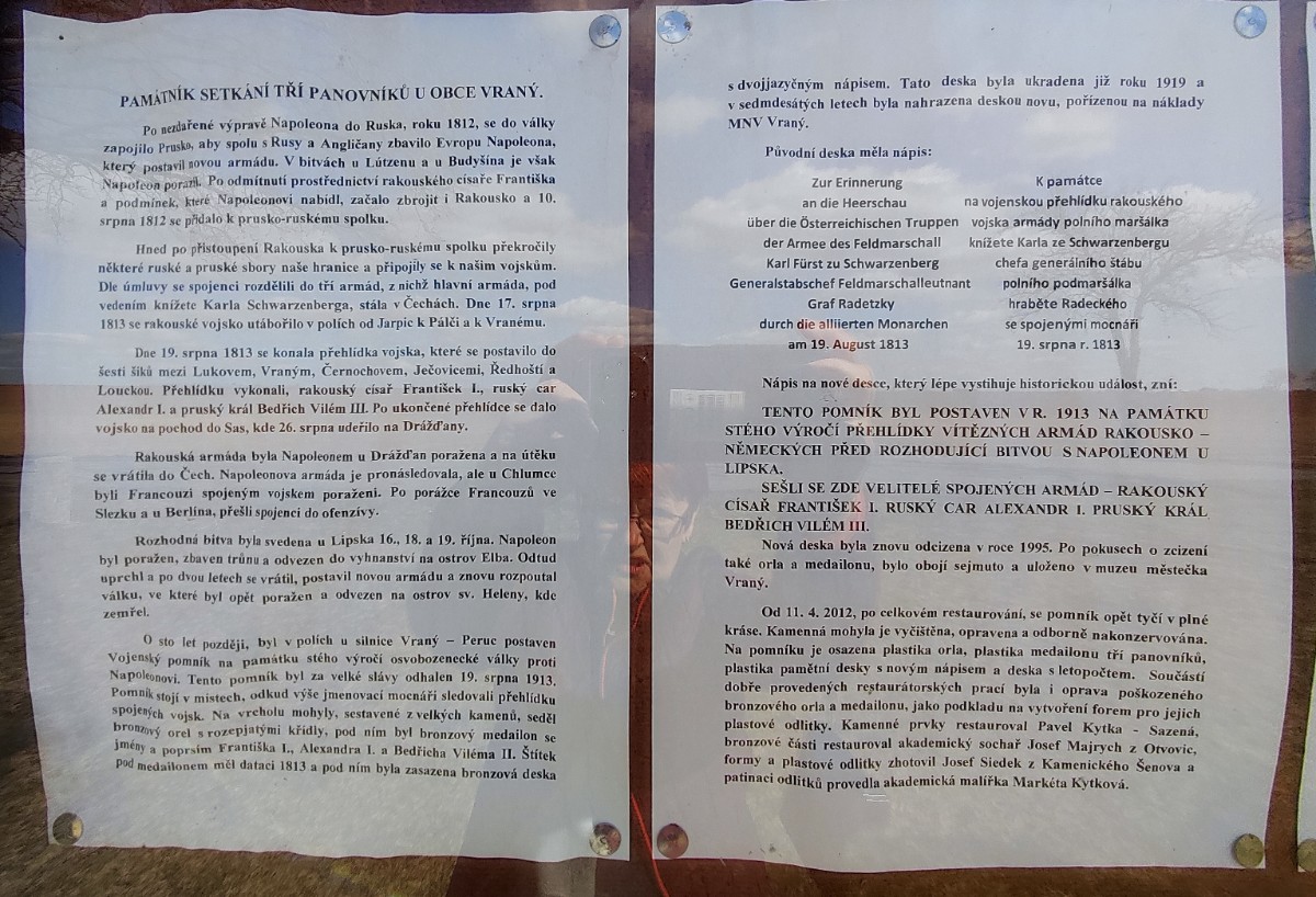 Budete-li pokračovat z Vraného do Peruce, narazíte u silnice na monumentální pomník. Jedná se o památník postavený v roce 1913 ke stému výročí setkání vojsk rakouského císaře, ruského cara a pruského krále. V tažení proti Napoleonovi tu 20. srpna 1813 provedli velkou vojenskou přehlídku před bitvou u Lipska.