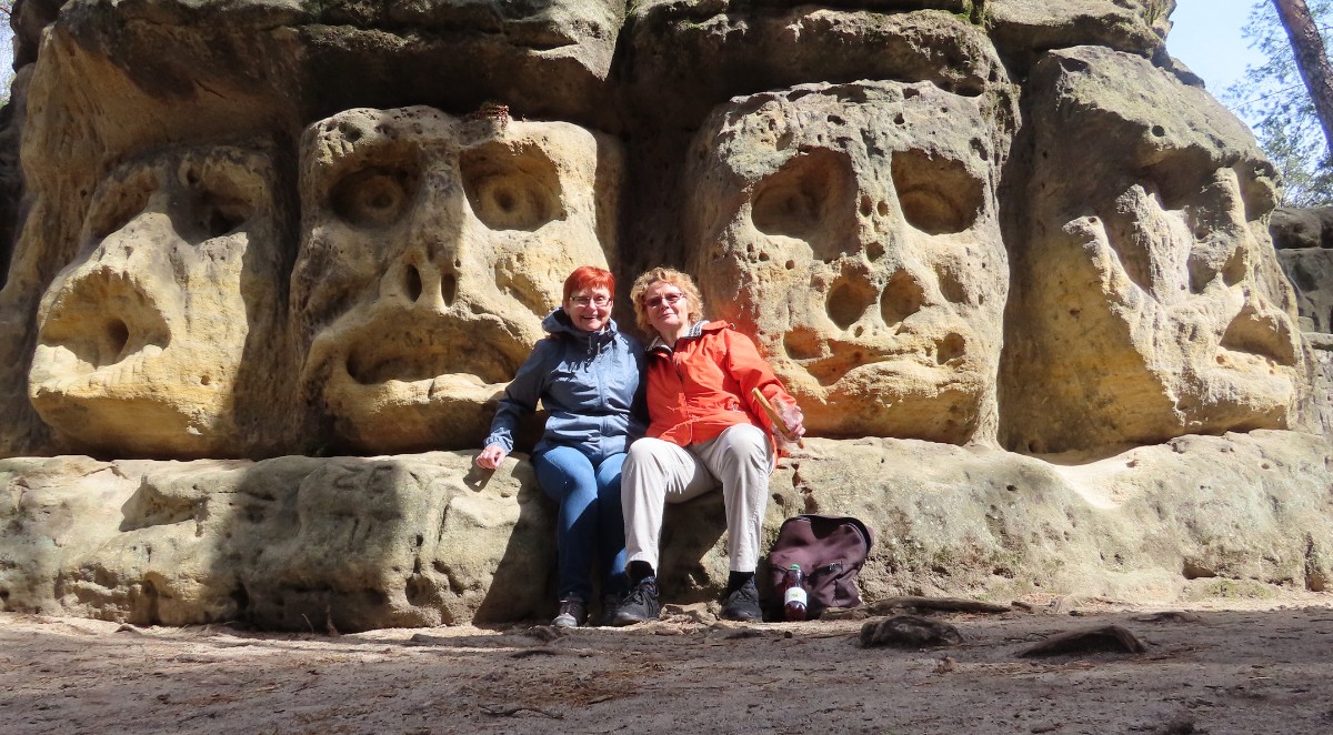 V Želízech jsme se vydaly na procházku lesem po žluté značce k pískovcovým skalám, které před rokem 1850 upravil tehdy mladý kuchař z liběchovského zámku, pozdější sochař Václav Levý. Došly jsme k harfenici, která bohužel vlivem času, ale hlavně asi vandalů, doznala značné újmy. Harfenici provázejí 4 velké hlavy a jeskyňka i s vytesanou lavicí. Tady jsme poseděly a posvačily a vydaly se dál k hadovi. Had měří 9 m a v polovině je přeťatý sekerou, která se nad ním vznáší. Hada prý Václav Levý vytvořil zřejmě proto, že se na skalách ve zdejších lesích vyhřívala klubka zmijí. Po lese poletovali první motýli, ptáci si prozpěvovali jarní písničky, nebe bylo modré a my jsme zvedaly hlavy vzhůru a klábosily.