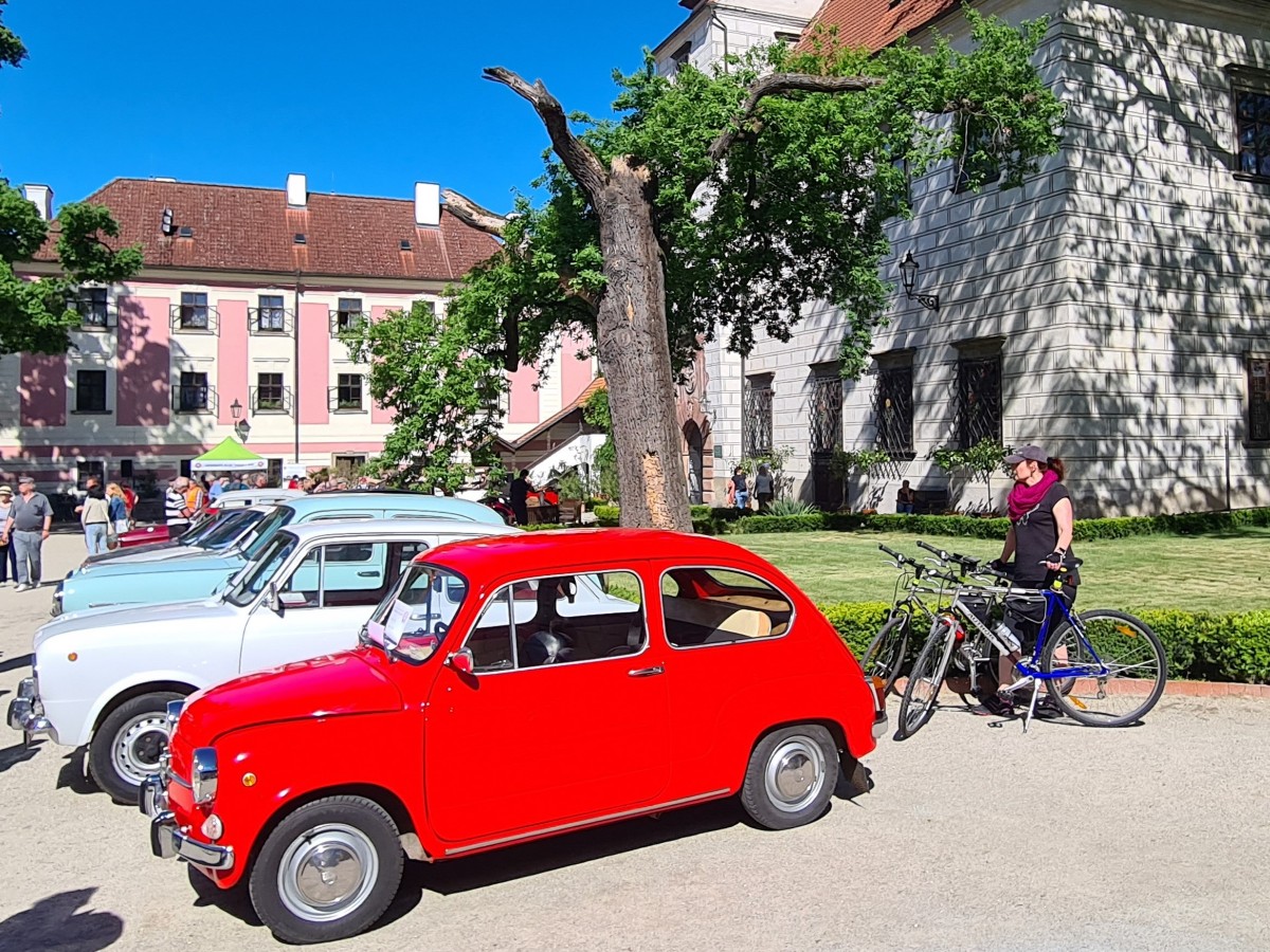 Zatímco můj manžel nakukoval pod otevřené kapoty, já hodnotila barvy laku a podivovala se nad znaky automobilek, které mi nic neříkaly. Pořídít fotku bez člověčí postavy bylo téměř nemožné, lidé se proplétali mezi auty, záhony i několika stánky. Do všeho toho mumraje hrála hudba, moderátor hovořil, i když, přiznám se, já nevnímala o čem. Lákaly mě totiž nejen vozy, ale také zámek zalitý květnovým sluncem.