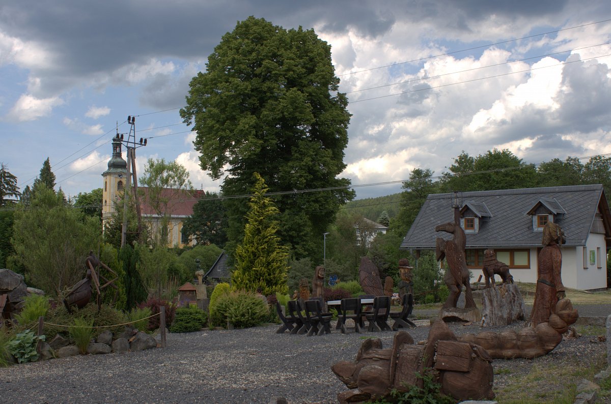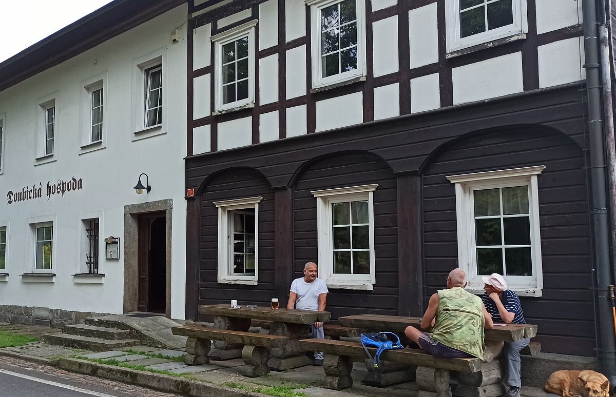 Potom už nás vítala Doubice se starými lidovými stavbami a krásně upravenými zahrádkami, kterých je v obci opravdu hodně. Prošli jsem okolo Doubické hospody, my jsme ale mířili do Staré doubické hospody, kterou obklopovaly vyřezávané dřevěné sochy a jiné zajímavé předměty. Přímo ráj pro rodiny s dětmi. Ze zahrádky před starou hospodou, kde jsme se občerstvovali, někteří chlazeným pivem, jiní zmrzlinovým pohárem, jsme měli krásný výhled na kostel Nanebevzetí Panny Marie. Vyřezávaných soch z lidské i zvířecí říše bylo okolo hospody a v přilehlém parčíku opravdu hodně. Potom už bylo načase vydat se po stejné trase zpět k našemu autu. Na krokoměru nám přibylo dalších 12 kilometrů do soutěže "Do stovky". Výlet se nám vydařil a všem můžeme návštěvu Chřibské a Doubice doporučit, stálo to opravdu za to.
