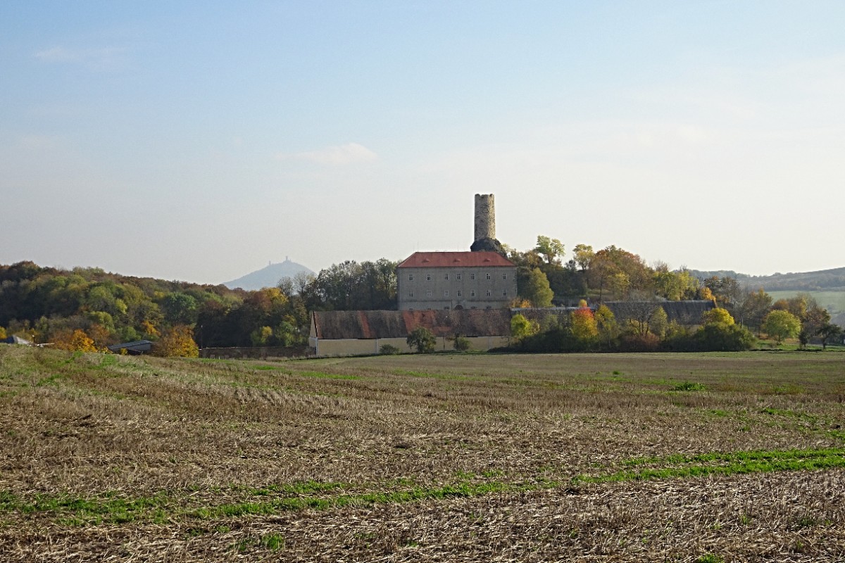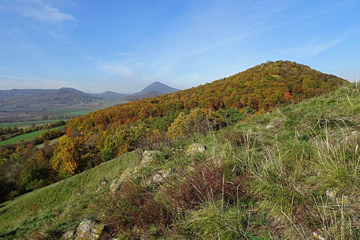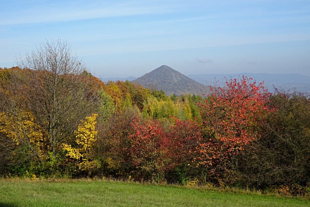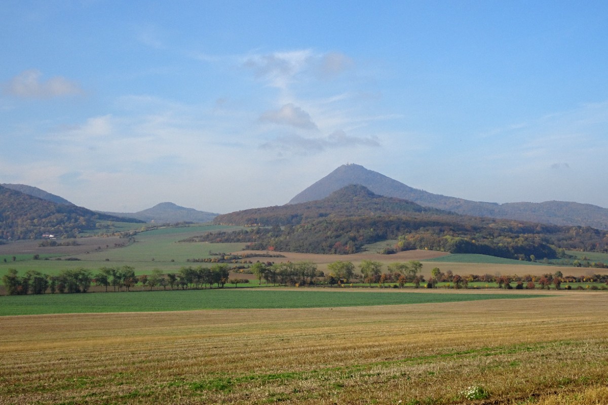 Na okraji Borče na mě řidič zavolal - chcete vystoupit tady nebo až dole ve vsi? Tady se mi to líbí, vystoupím. A hned "odtud" se mi otevřel pohled na ještě ospalý Lovoš. Cvak na něj, cvak na kamenný kříž a dolů jdu po svých. Stavení při cestě, označené v mapách jako Zámek Boreč, žaluje a hrozí zřícením. Za vsí Boreč u křížku začíná cesta zvolna stoupat a vede po úpatí zalesněného Sutomského vrchu. Cíl mého výletu - Holý vrch (458 m), na něj navazuje. Na vrch nevede značená turistická cesta a neviděla jsem ani cestu vyšlapanou, takže jsem ho skoro celý obešla, než jsem si uvědomila, že tudy cesta nevede. Musela jsem se vrátit a za pomoci mapy v mobilu jsem vystoupala na vrch, místními důvěrně nazývaný Holáček, který si nezadá se svým názvem. Věřte mi, že pohled do kraje magického Českého středohoří bych přála vám všem. Posadila jsem se na vršku, sama samotinká v lůně podzimně vyšňořené přírody a v duchu si vyjmenovávala všechny kopečky, jeden krásnější než druhý. Na dosah jsem měla červený a zlatý Sutomský vrch, za ním vykukovala Milešovka, pod ní se krčil Ostrý se zříceninou hradu a vlevo nepřehlédnutelná Lipská hora. Vpravo Lovoš a za ním sotva tušený Radobýl a Litoměřice. Za mnou Ovčín, Jezerka. Proti světlu jižním směrem na obzoru Házmburk a pode mnou Sutom a Vlastislav se zříceninou hradu Skalka, kam za chvíli sejdu.