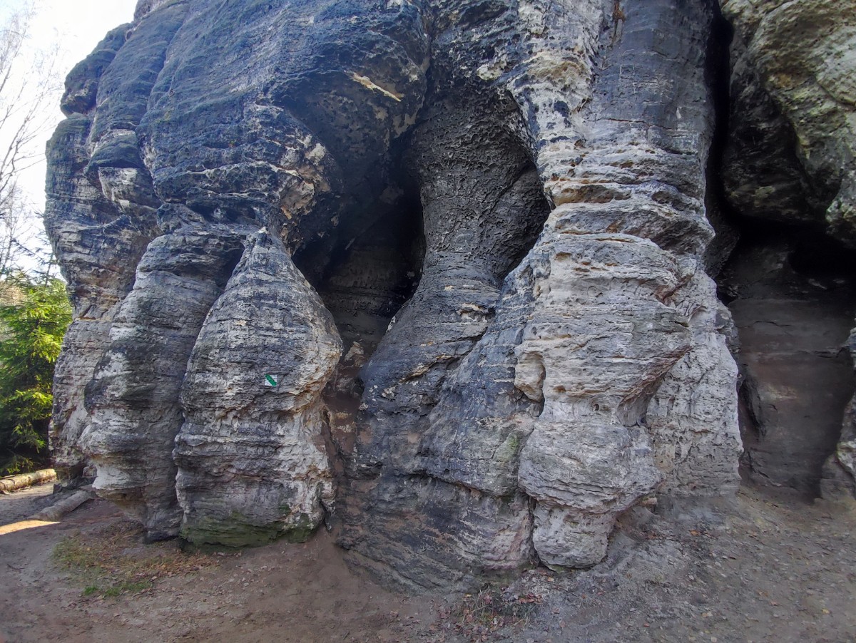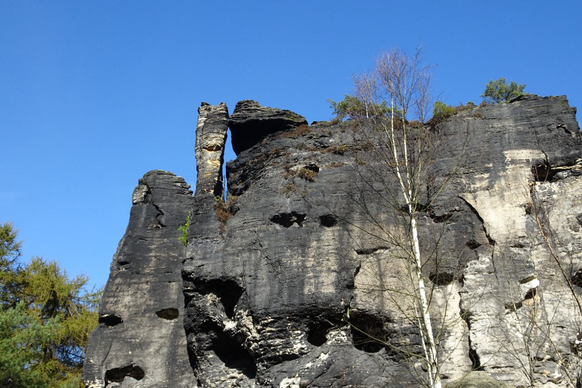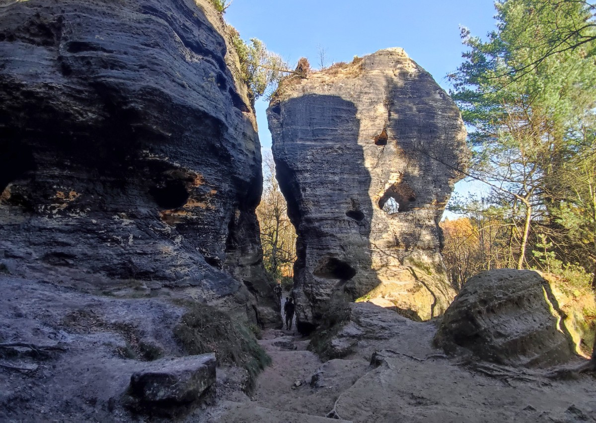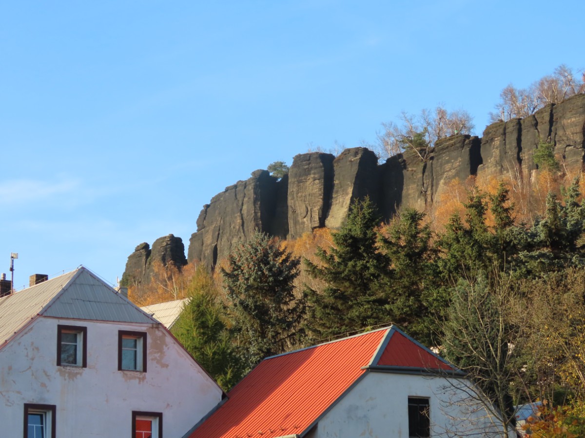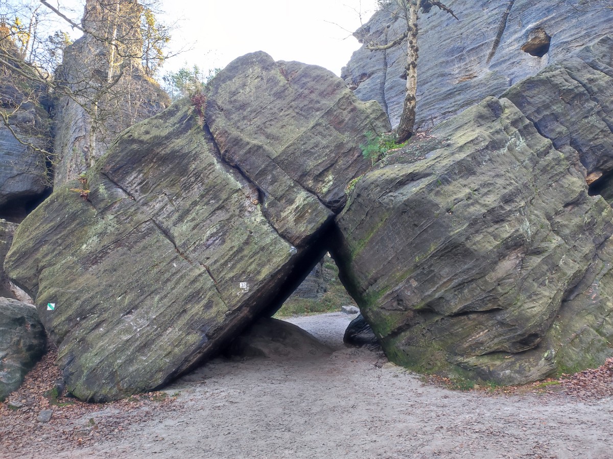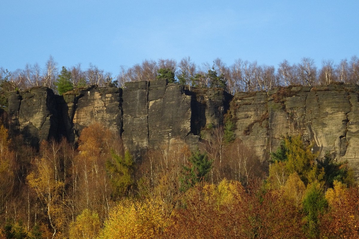 Skalní město Tiské stěny najdeme nad vsí Tisá. Je součástí CHKO Labské pískovce a tmavé stěny tvoří neuvěřitelnou kolmou kamennou hradbu nad vesnicí. K pokladně je to od kostela sv. Anny ve vsi jen kousek. Moje představa, že v pondělí 31. října, kdy u nás bylo právě po prázdninách a nikdo tam nebude, vzala rychle za své. U pokladny se táhl dlouhý had turistů, hovořících vesměs německy. Však Tiské stěny jsou prakticky na hranicích a jak se ukázalo, v Německu měli svátek.