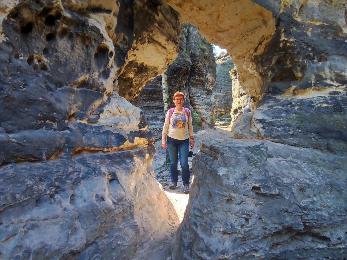 Konec perónu na nádraží nebyl prakticky vidět, ale srdnatě a s nadějí jsem vyrazila. Labské údolí až do Ústí n. L. nedoznalo žádné změny. Nastoupila jsem do autobusu směr Bahratal, tj. státní hranice s Německem, a vyrazili jsme vzhůru. Jakmile jsme projeli vesnicí Strážky, jako kouzlem jsme se ocitli v jiném světě. Světě plném světla, tepla a dobré nálady. To už zbýval jen kousek do cíle mého výletu, Tiských stěn.